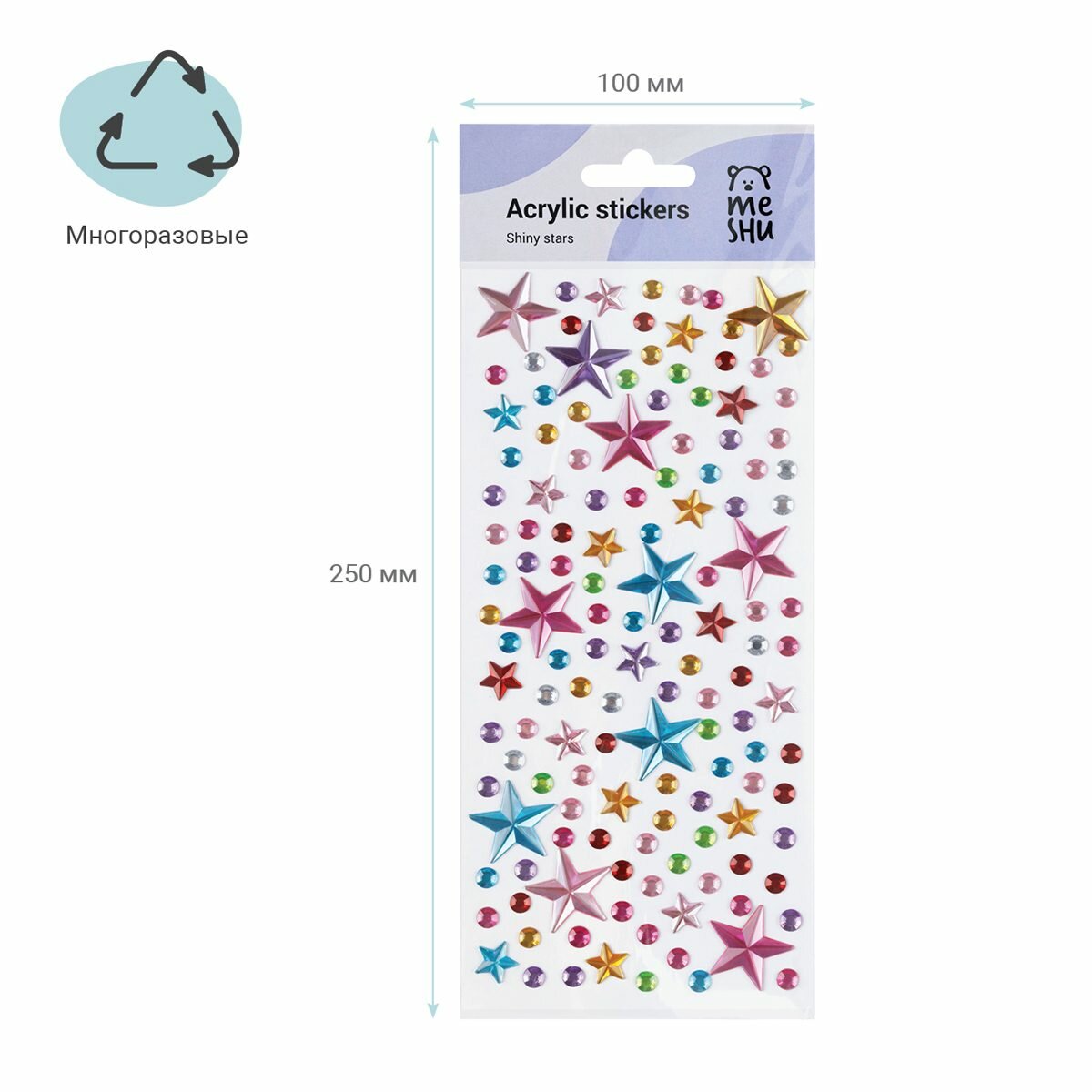 Наклейки акриловые MESHU яркие, сверкающие стразы для декорирования. Они идеально подходят для украшения любых поделок. Многоразовые наклейки можно приклеить на открытку, подарочную упаковку, канцтовары, предметы интерьера, мобильный телефон, очки, ноутбук или любой другой аксессуар. Легко отделяются от основы и надежно держатся.