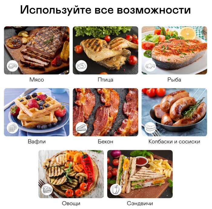 | Особенности | съемные пластины, поддон для сбора жира, регулировка высоты верхней панели, антипригарное покрытие, открывание крышки на 180 градусов |