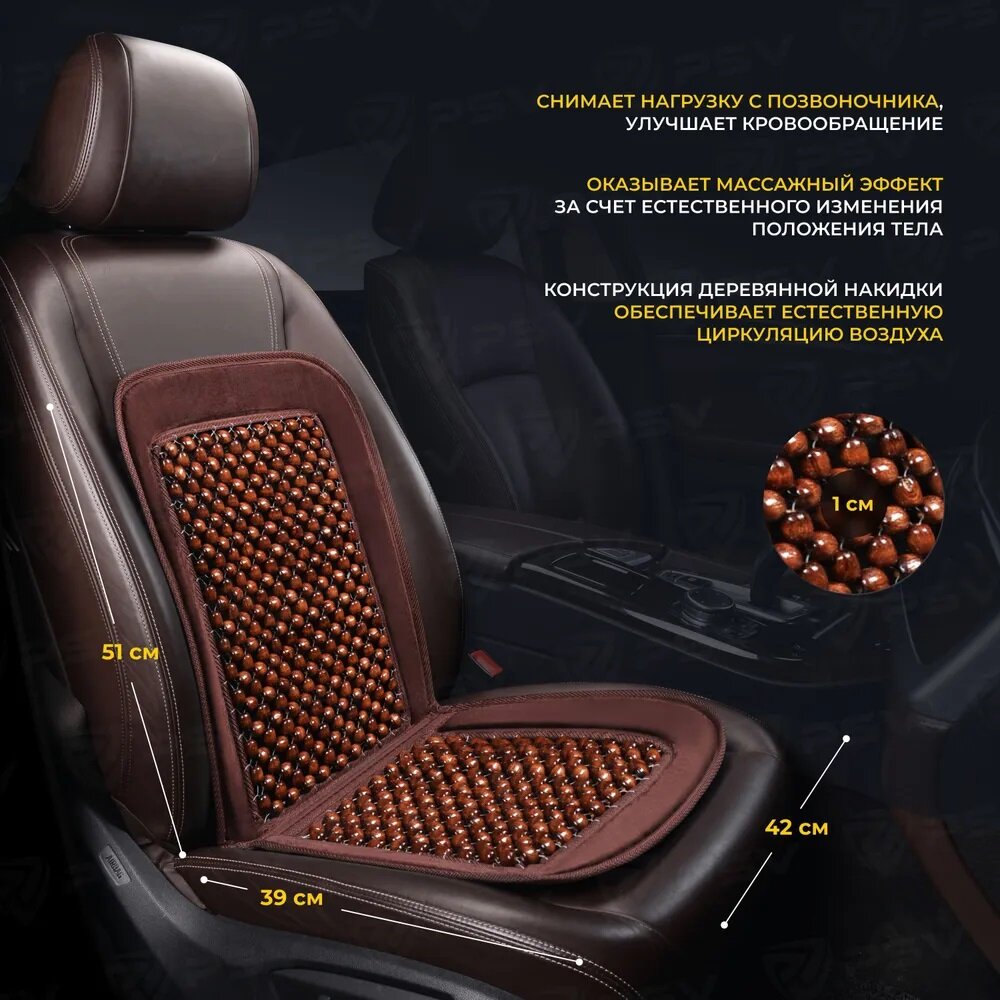Классическая накидка из полиэстера с деревянными шариками. Накидка массажная С118 на 80% состоит из деревянных шариков. Шарики расположены по всей поверхности соприкосновения с водителем. Накидка обеспечивает комфортное вождение, обладает массажным действием благодаря нефиксированным шарикам, также накидка обладает охлаждающим эффектом. Размер накидки: Спинка - 51 х 43 см Сиденье - 40 х 44 см