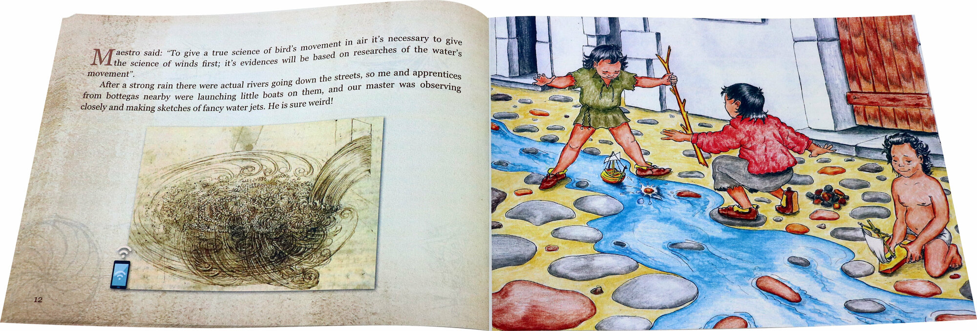 The book is made for children of early and middle age, who learn new digital technologies and eager to know more about Leonardo da Vinci's creation.