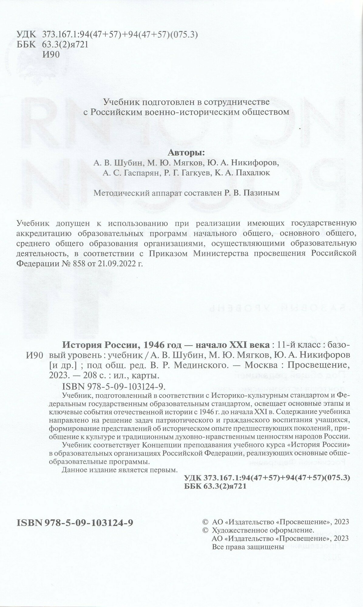 История России. 11 класс. 1946 год - начало XXI века. Учебник. Базовый уровень. ФГОС (Александр Владленович Шубин, Юрий Александрович Никифоров, Михаил Юрьевич Мягков); Просвещение, 2024