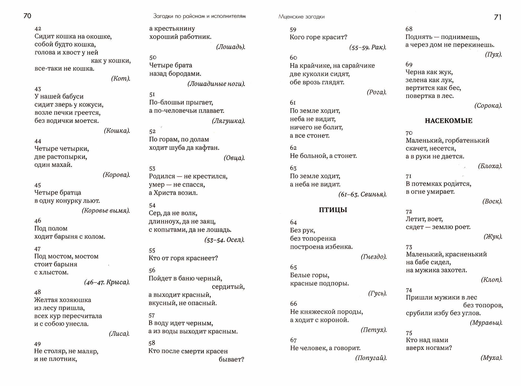 У меня когда-то были издания (сборники) загадок и пословиц и поговорок Рыбниковой М.А., но со временем сами издания от долгого применения (например, сборник загадок еще, насколько помню, конец 30-х годов ХХ века) пришли в не очень хорошее состояние... Поэтому это издание, включившее под одну обложку оба отдельно изданные некогда сборника очень своевременно! И загадки, и пословицы распределены по тематическому методу, что облегчает поиск нужной загадки или пословицы. Сохранены предисловия составителя к первым изданиям, все примечания и пояснения. Но есть замечание лично от себя: нужно учитывать пометки бытования (записи) загадок по областям, т.к. после издания сборника загадок в 30-е годы прошлого века некоторые области или переименовывались, или были объединены, а иногда даже менялись границы областей. Но само издание очень порадовало! Считаю приобретение такой книги для себя большим подарком!