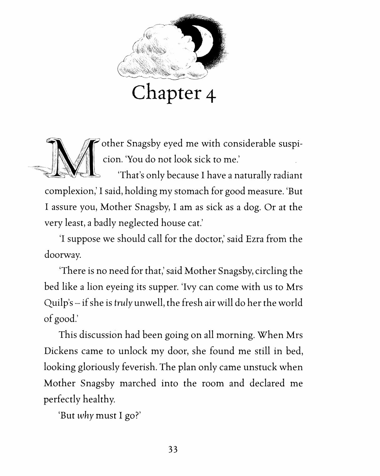 Ivy is now the beloved daughter of Ezra and Mother Snagbsy, coffin makers, even if she does have to work rather like a maid. Their trade is roaring, and Ivy is as happy as a pig in clover. Especially when she escapes to the library to talk to the devastatingly sympathetic Miss Carnage.