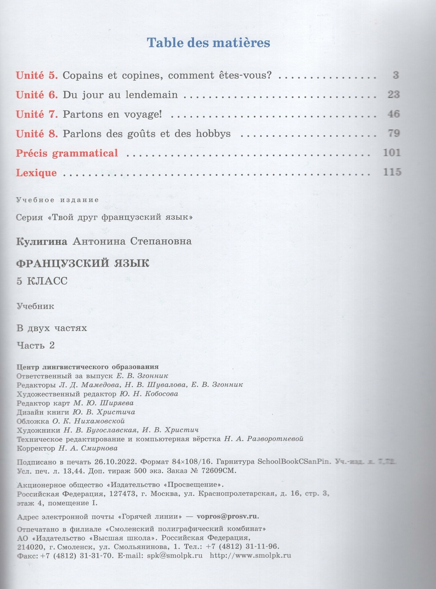 Французский язык. 5 класс. Учебник. В 2-х частях (Кулигина Антонина Степановна); Просвещение, 2023