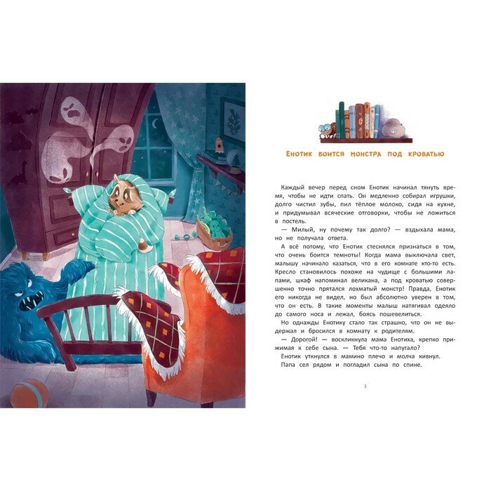 Вместе с малышом Енотиком ваш ребёнок поймёт, почему не нужно бояться монстров под кроватью и визита врача, узнает, как весело можно проводить время в детском саду или с бабушкой, и перестанет бояться недолгой разлуки с мамой, сможет побороть страх перед насекомыми и публичными выступлениями.