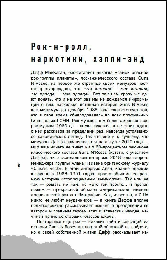 Отличнейшая автобиография, одна из лучших на данный момент из тех, что я прочел. Дафф - самородок!!! Отличная история с классным финалом, правда книга заканчивается 2011 годом, а жизнь автора ещё идёт и развивается. В целом довольно прикольные жизненные моменты, не сильно разнится с биографией Слэша, но развязка очень приличная, и то как он соскочил с алкашки и наркоты, и то какие решения принимает. Книга написана простым, понятным языком - рекомендую к прочтению!!!