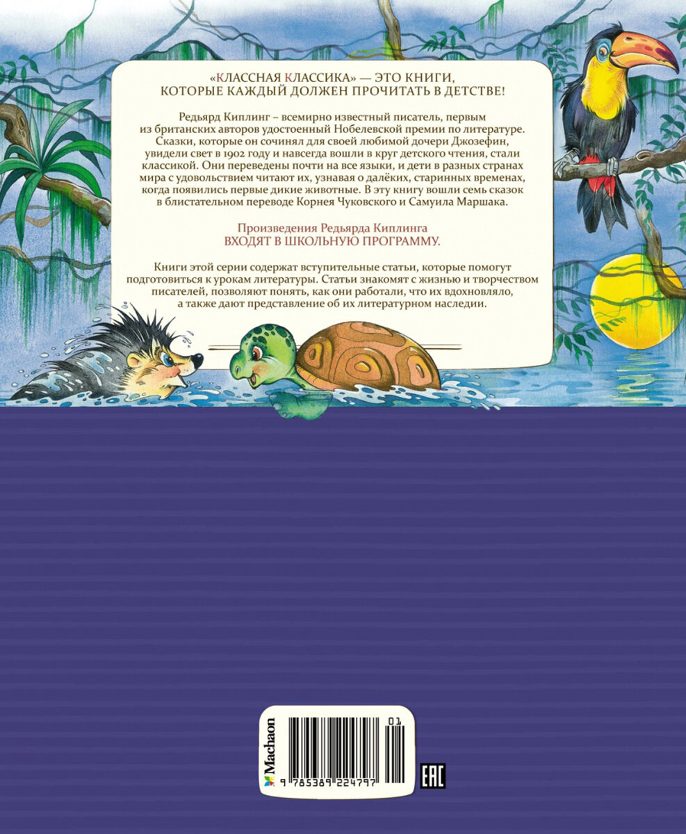 Какое хорошее издание! Все любимые сказки Р.Киплинга с неповторимым индийским колоритом собраны в одной книге. Даже моя любимая Рики Тики Тави есть, и все в полном объеме, без детских адаптаций и сокращений! Сказки очень интересные, со смыслом, душой и полезными знаниями. Конечно есть и большая доля выдумок, сказки же.