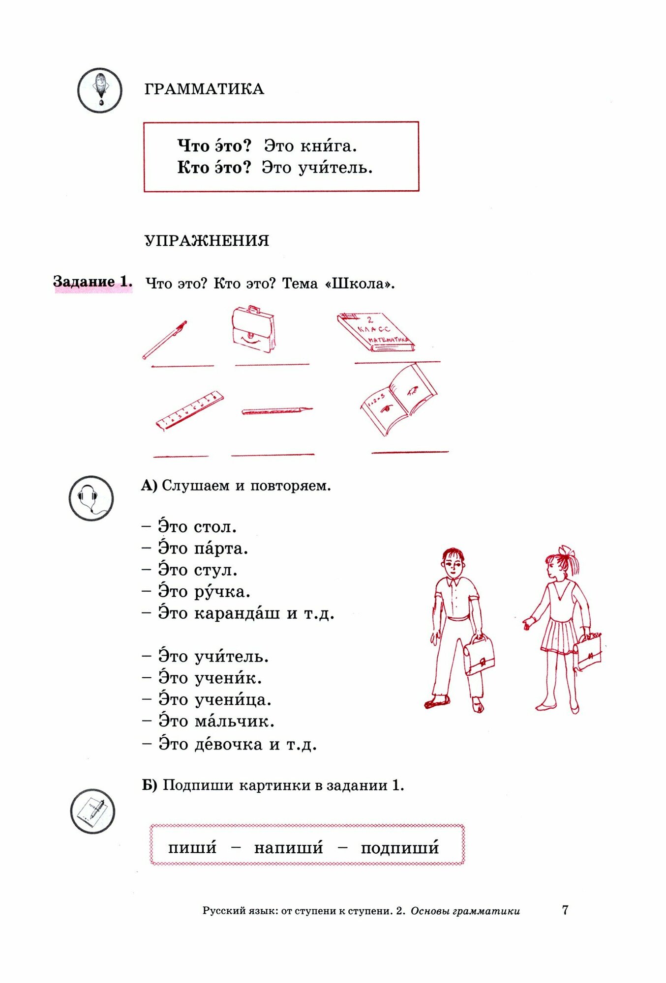Основным принципом организации уроков является взаимосвязь изучения грамматики и лексики. При этом разнообразные грамматические упражнения в пособии часто подаются в форме диалогов и игровых заданий, сочетаются с работой над картинкой, раскрашиванием или рисованием, что стимулирует речевую активность ученика и способствует созданию живой и творческой атмосферы на уроке.