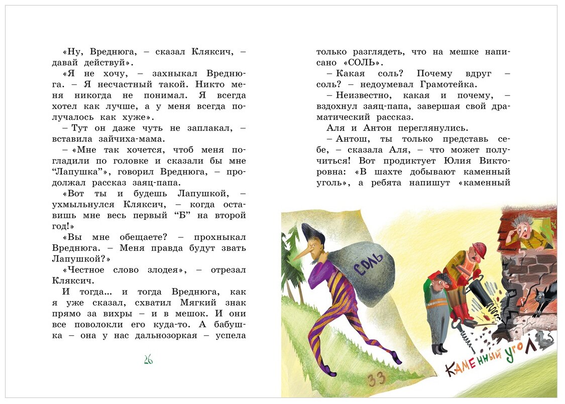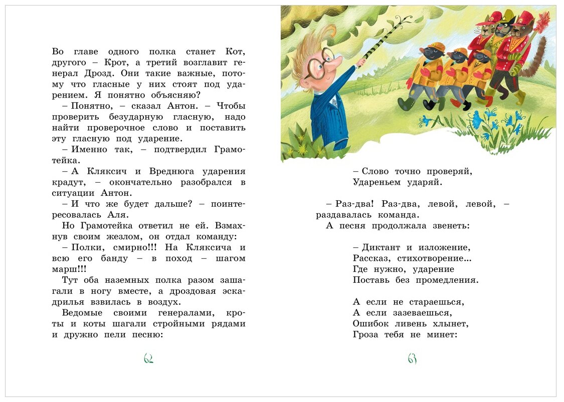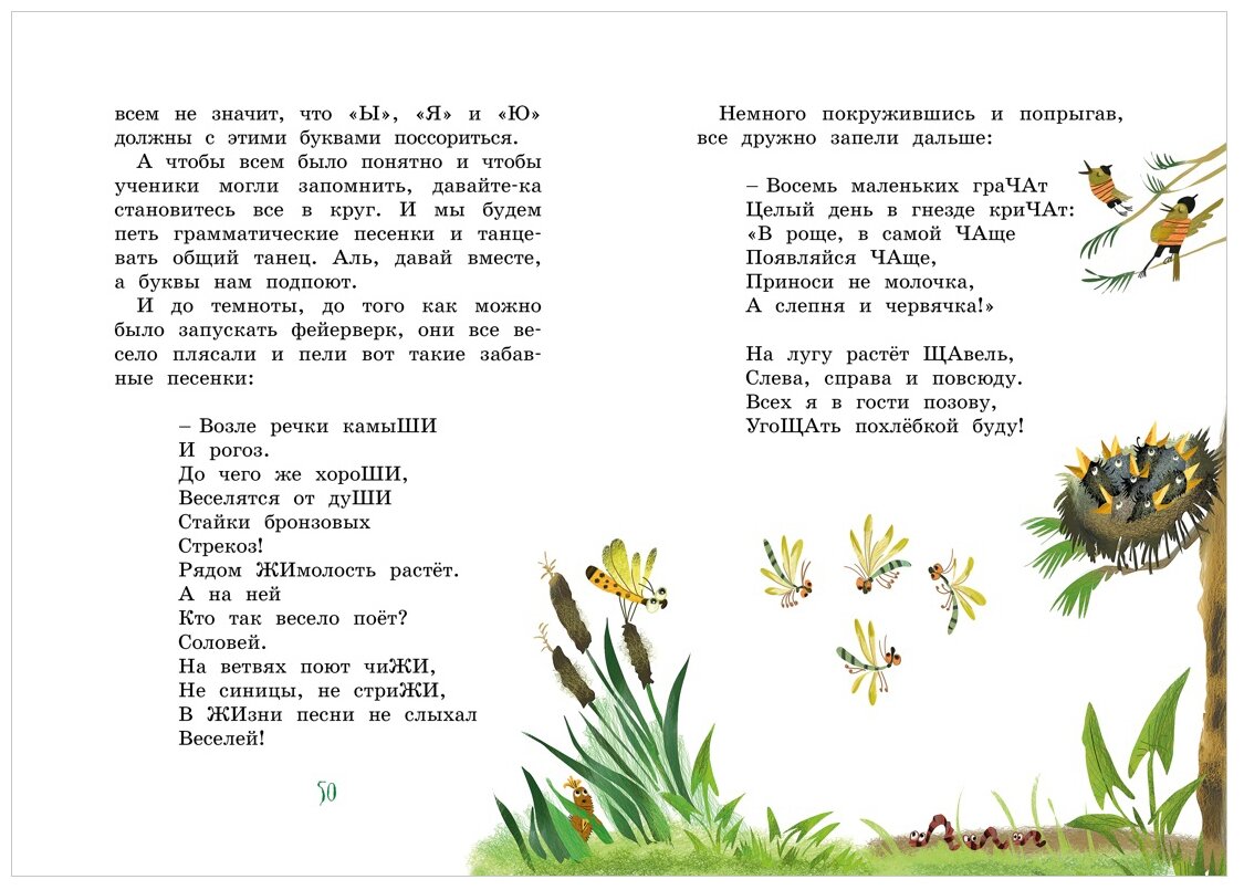 Последняя часть из известной трилогии рассчитана на школьный возраст. Здесь затрагиваются более сложные правила, такие как «ча-ща», «жи-ши», написание мягкого знака, ударные и безударные гласные. Обратите внимание, что для интересного чтения ребенок должен быть знаком с такими правилами.