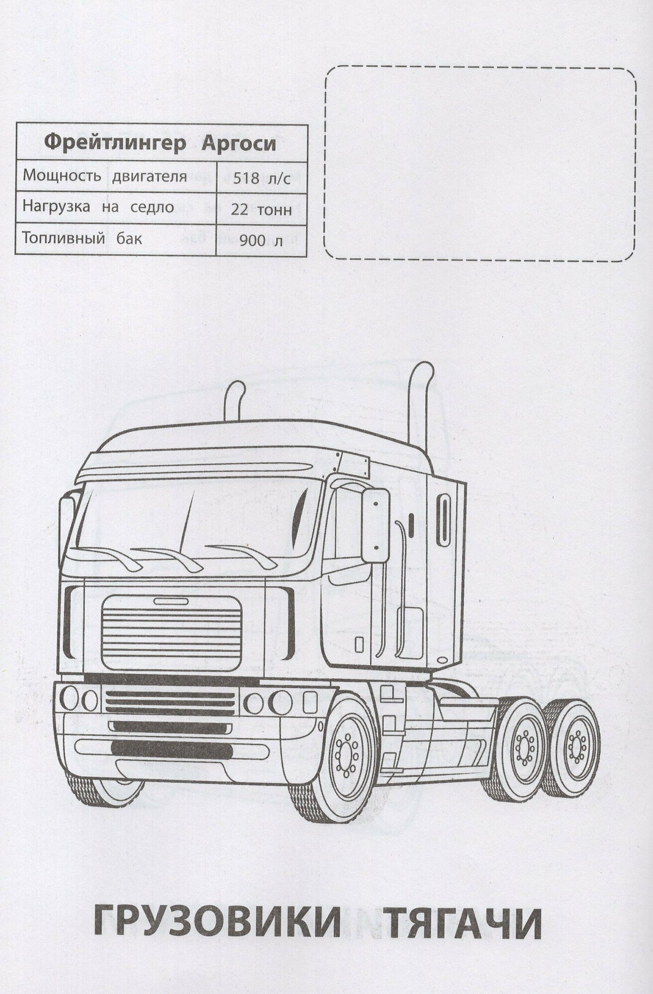 Эта раскраска отлично подойдёт для мальчиков разных возрастов. Помимо возможности раскрасить грузовички, можно также наклеить сверху в специальное окошечко соответствующую наклейку, а так же прочитать небольшую, но интересную информацию о данном грузовике, тягаче.