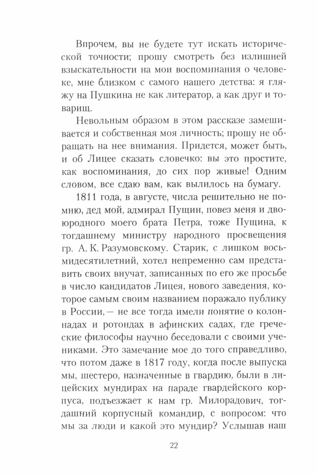 Книга адресована всем, кто интересуется личностью А.С. Пушкина. Собственно сами записки Ивана Пущина о своём друге в данном издании занимают немного места - 41 страницу. из 186. То есть книга сама по себе небольшая, а пущинские воспоминания и того меньше.Остальное - предисловие, лицейские стихи, комментарии.Записки ценны тем, что их оставил человек близко знавший поэта.Взгляд и оценка друга может быть намноге важнее, чем многие тома, написанные пушкиноведами. Книга издана в твёрдом переплёте весьма неплохо, однако имееется существенный недостаток - ни одной иллюстрации, никаких портретов (кроме обложки) или пушкинских зарисовок. При том, что первоначально заявленная цена поражает несоразмерностью -1015 рублей. Такую цену может иметь художественный каталог с цветными репродукциями, а не стандартная книга с тонкой бумагой.