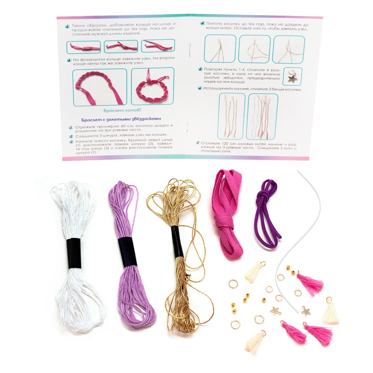 В наборе: нитки мулине, металлические шармики, кожаные шнурки, бусины, металлические нити, подробная инструкция.
