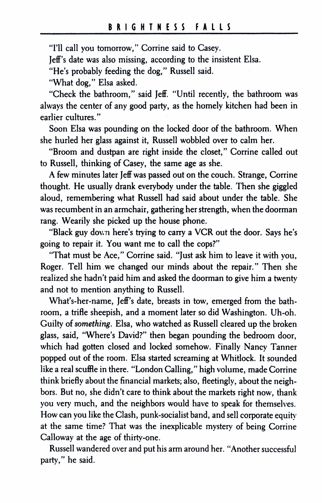Corrine Calloway is a young stockbroker on Wall Street, her husband Russell an underpaid but ambitious publishing editor. The happily married couple head into New York's 1980s gold rush, awash with prospects and promise, where the best and brightest vie with the worst and most craven for riches, fame and the love of beautiful people. But the Calloways soon discover that what goes up must come crashing down, both on Wall Street and at home. Brightness Falls captures lives-in-the-making: men and women confronting adulthood with wit and low behaviour, fear and confusion, and, just occasionally, a little honesty and decency.