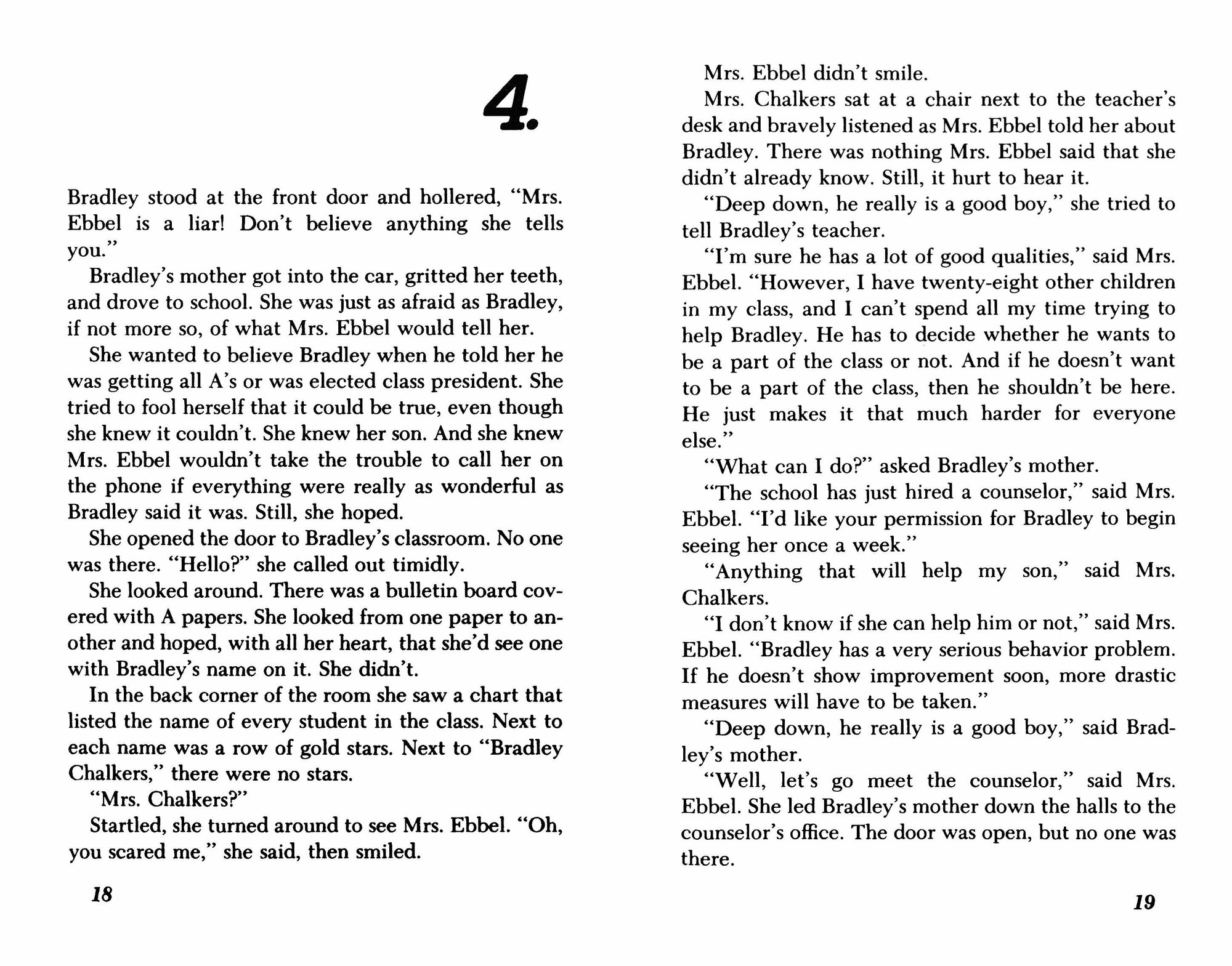 Meet Bradley Chalkers. He's the oldest child in the class. He tells enormous lies. He picks fights with girls. The teachers say he has 'serious behaviour problems'. And no one likes him ... Except Carla, the new school counsellor. She thinks Bradley is kind and generous, and she even enjoys his far-fetched stories.