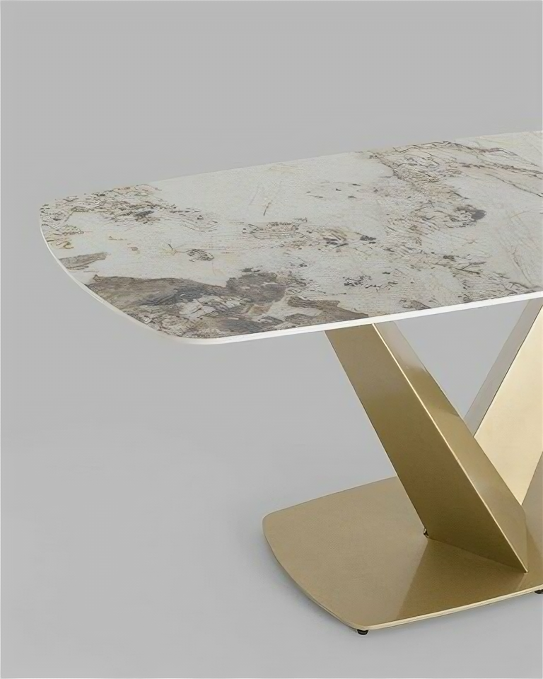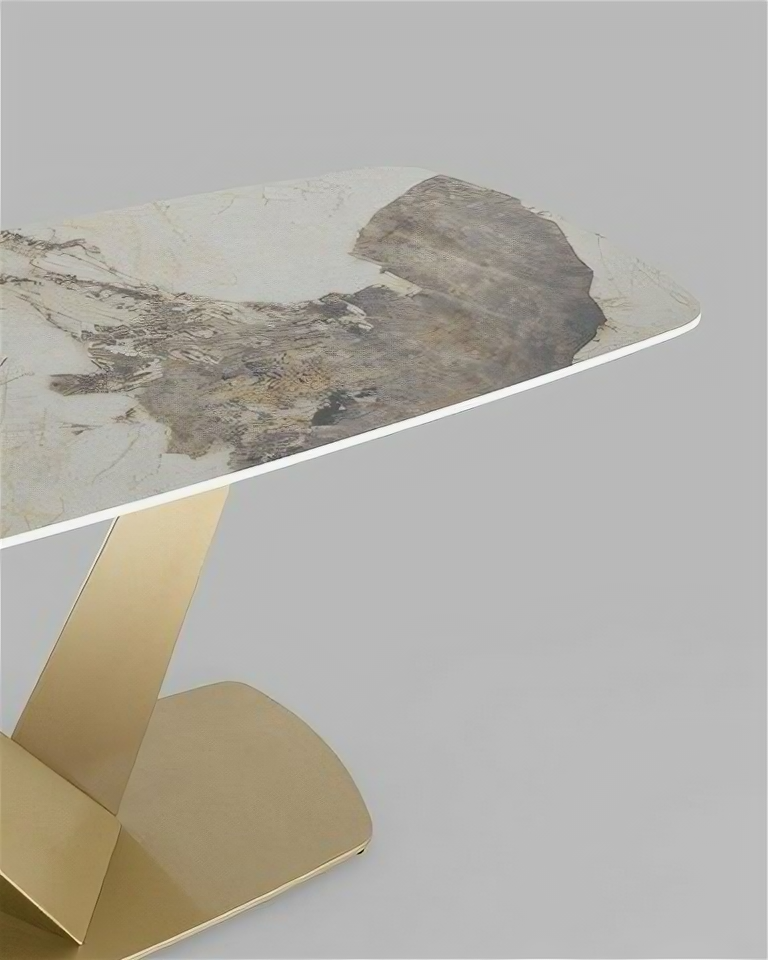 Обеденный стол Аврора.Столешница сочетает в себе прочную керамику, покрытую слоем закалённого стекла для практичности и стиля. Материалы устойчивы к перепадам температуры, к чрезмерной влаге, любые загрязнения легко устранить. Поверхность повторяет рисунок изысканного мрамора, излучая комфорт и спокойствие. Металлический каркас золотого матового цвета из двух объёмных балок образуют простую и надежную конструкцию. Роскошное сочетание цветов позволяет подобрать к столу любые комплекты стульев в современном стиле.