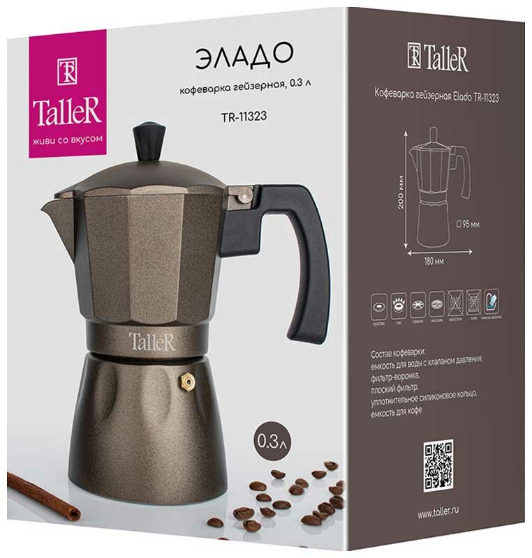 Кофеварка гейзерная TalleR Elado 300 млГейзерная кофеварка - это простой, надежный и быстрый способ сварить кофе. У корпуса из литого алюминия внешнее жаростойкое покрытие. Латунный клапан для сброса избыточного давления надёжен и безопасен. У эргономичной ручки приятное на ощупь декоративное покрытие. Материал ручки - нейлон с нескользящим покрытием.Объём кофеварки 300 мл, максимальный объем готового кофе 280 мл. Состав кофеварки: ёмкость для воды с клапаном давления, фильтр-воронка, плоский фильтр, уплотнительное силиконовое кольцо, ёмкость для кофе. Упакована в картонную коробку.Рекомендована ручная мойка. Подходит для всех типов плит, кроме индукционной.