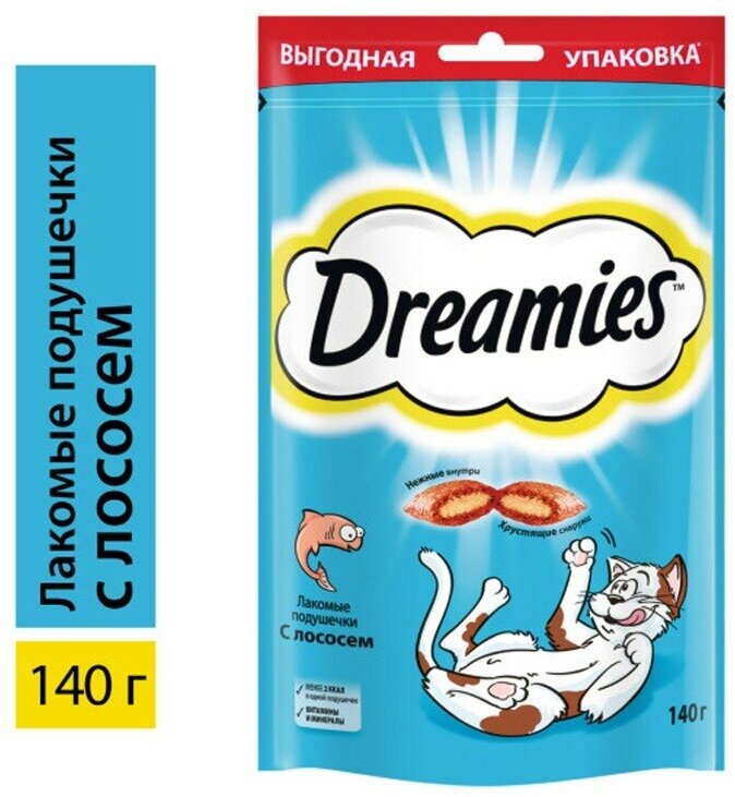 DREAMIES с лососем это лакомство, которое любят все коты на свете. Смело заводите дома аквариум, ваш усатый рыбак больше не обратит внимания на рыбок, ведь есть аппетитные хрустящие подушечки DREAMIES с нежным лососем внутри! Просто рыбная сказка для вашего кота! В состав DREAMIES Лакомые Подушечки входят важные для кошки питательные вещества, витамины и минералы, а значит, такое угощение приносит не только радость, но и пользу.Состав:Белковые растительные экстракты, злаки и продукты их переработки, мука животного происхождения, мука из рыбы (в том числе мука из лосося минимум 4%), животные жиры и растительное масло, гидролизат животного происхождения, витамины и минералы.
