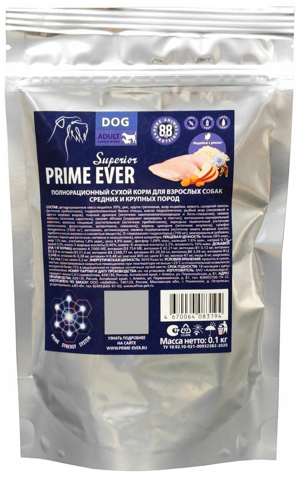 Полнорационный сухой корм для взрослых собак средних и крупных размеров весом до 40 кг. Корм PRIME EVER Superior является супер-премиальным и полнорационным. Все корма данной линейки содержат Prime Synergy System - систему синергии натуральных компонентов, которая позволяет питомцу усвоить весь комплекс питательных веществ. Основная часть ингредиентов выращивается в чистейшем и красивейшем крае – на Алтае. Щадящая технология производства способствует максимальной сохранности питательных веществ и витаминов, корм лучше усваивается и заметно улучшается состояние кожи и шерсти питомца, а также всего здоровья в комплексе.Размер гранулы 14-15 мм.