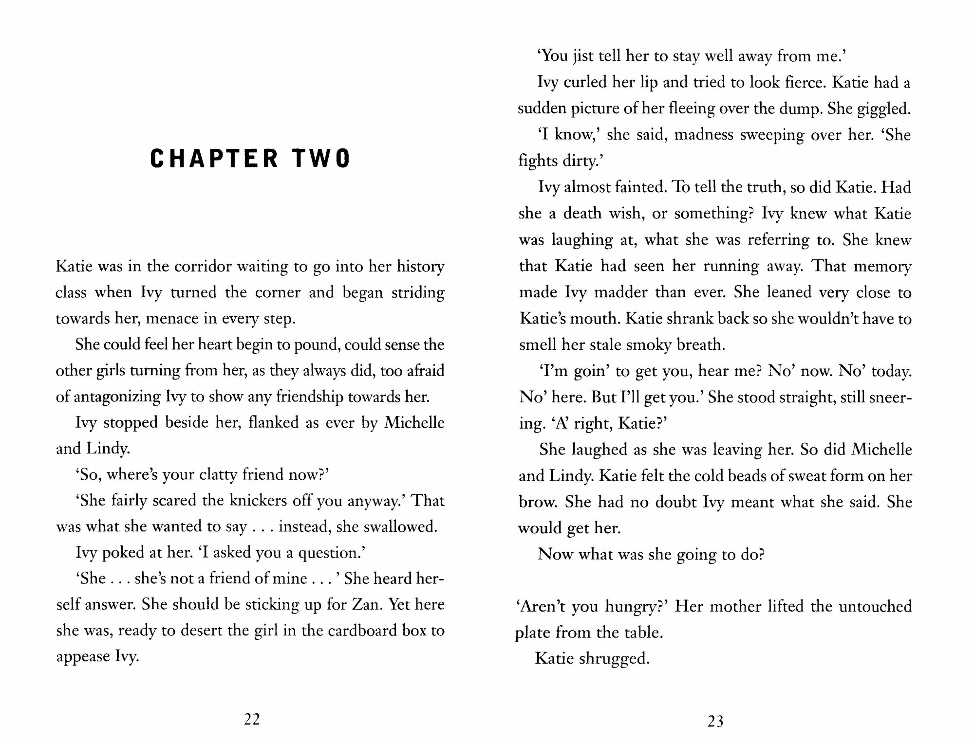 Katie is being bullied at school - and cannot get anyone to believe her. She feels frightened and alone . . . until one day when she is cornered by Ivy and her fellow bullies on the town dump. Katie is terrified, there is nowhere left to run. But suddenly, as if by magic, a girl called Zan rises from the rubbish in the dump and leaps to Katie's defence. But Zan is not willing to talk to Katie - all she wishes to do is keep her identity a secret. Slowly Katie learns the truth about Zan, and when she does, she realises Zan has much more to lose than the safety of her cardboard box. A gripping story that really brings the issue of bullying to a head.