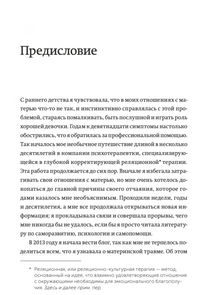 С раннего детства я чувствовала, что в моих отношениях с матерью что-то не так, и инстинктивно справлялась с этой проблемой, стараясь помалкивать, быть послушной и играть роль "хорошей девочки". Годам к девятнадцати симптомы настолько обострились, что я обратилась за профессиональной помощью. Так началось мое необычное путешествие длиной в несколько десятилетий в компании психотерапевтки, специализирующейся на глубокой корректирующей реляционной терапии. Эта работа продолжается до сих пор. В начале я избегала затрагивать свои отношения с матерью, но мне очень хотелось докопаться до главной причины своего отчаяния, которое годами казалось мне необъяснимым. Проходили недели, годы и десятилетия, а мне все продолжала открываться новая информация; я прокладывала связи и совершала прорывы, чего мне никогда бы не удалось, если бы я просто читала литературу по саморазвитию, психологии и самопомощи.