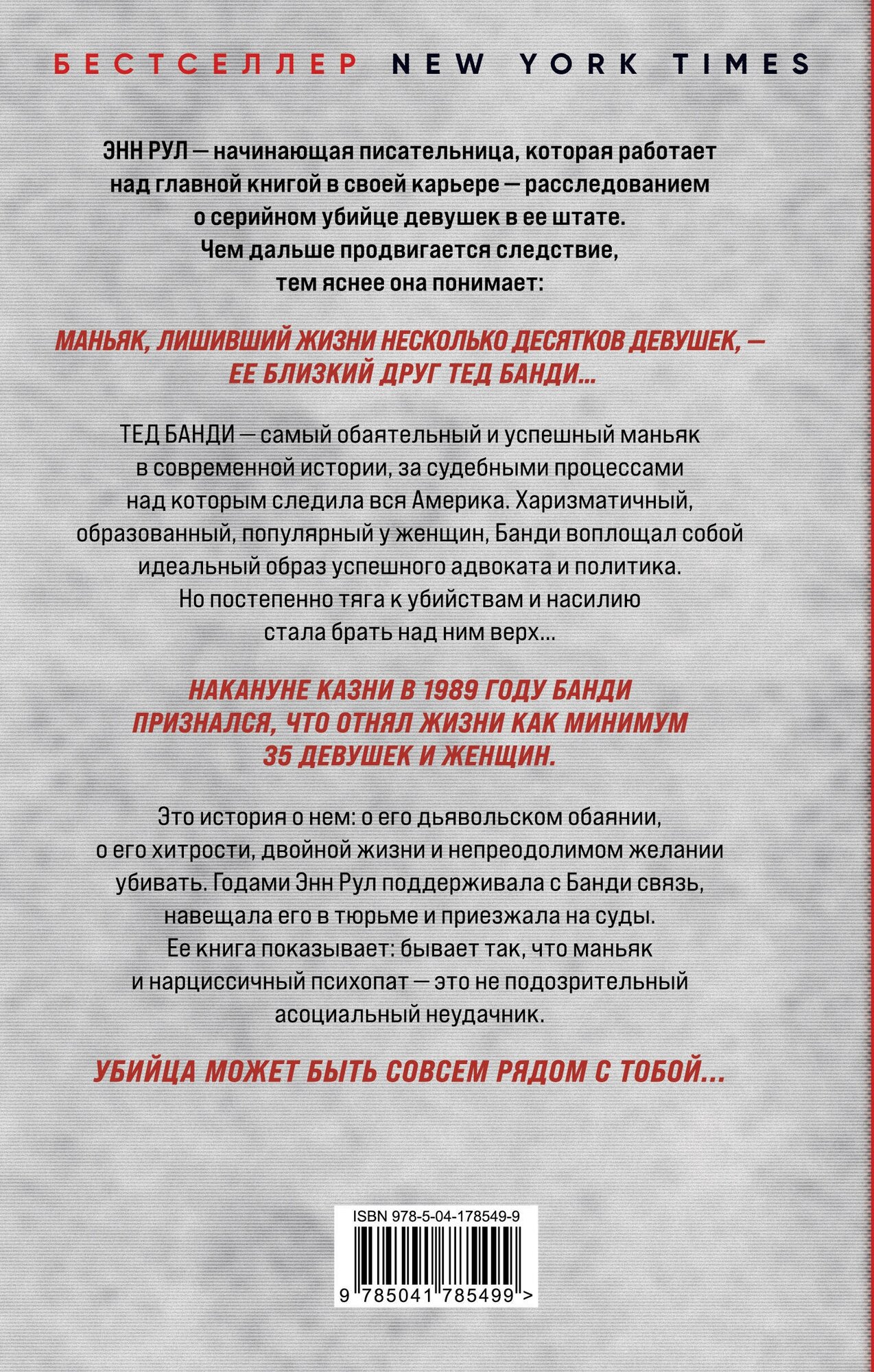 Как получилось так, что обаятельный и успешный студент юридического факультета, которому прочили головокружительную карьеру, стал разъезжать на машине и заманивать в нее юных девушек, безжалостно убивать и расчленять их? Эта книга - подробная хроника его жизни и его преступлений, его двойной жизни и непреодолимого желания убивать. Годами писательница Энн Рул, не в силах противиться манипуляторским чарам Банди, поддерживала с ним связь, писала и навещала его в тюрьме, приезжала на суды. Результатом этой дружбы стала книга, которая считается "лучшей тру-крайм книгой всех времен", а личность Теда Банди, неразгаданная и непревзойденная даже спустя сорок лет, будоражит умы криминалистов и продолжает оставаться источником вдохновения в массовой культуре.