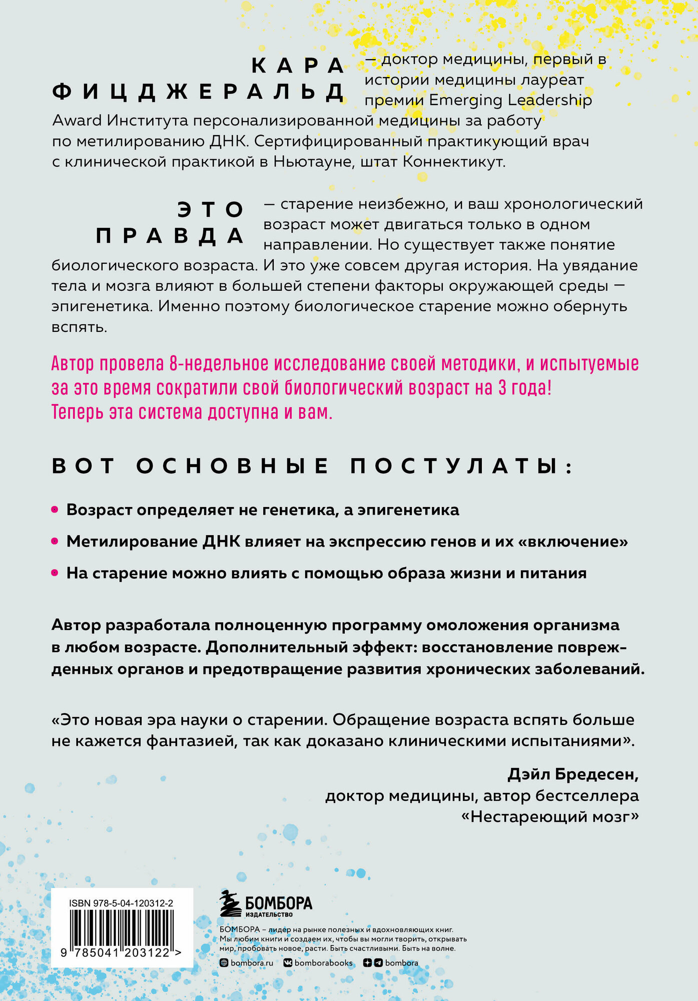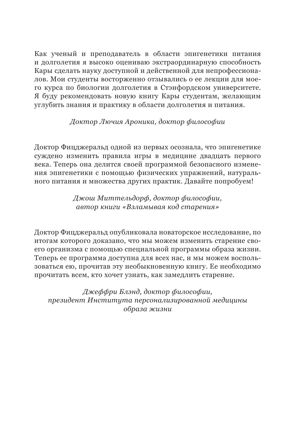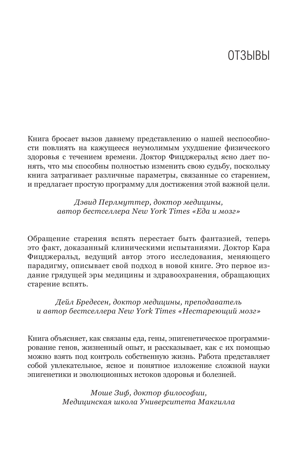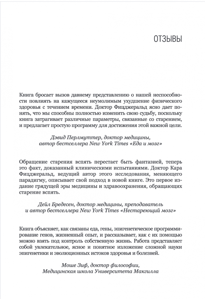 Старение неизбежно, и ваш хронологический возраст может двигаться только в одном направлении. Но еще есть понятие биологического возраста, который ученые могут измерить, оценив, как экспрессируются гены. Новое захватывающее исследование Кары Фицджеральд показывает, каким именно образом можно заставить тело в прямом смысле омолаживаться. Автор подробно описывает процесс метилирования ДНК и объясняет, как различные факторы эпигенетики способны воздействовать на него, заставляя нас стареть быстрее или медленнее.