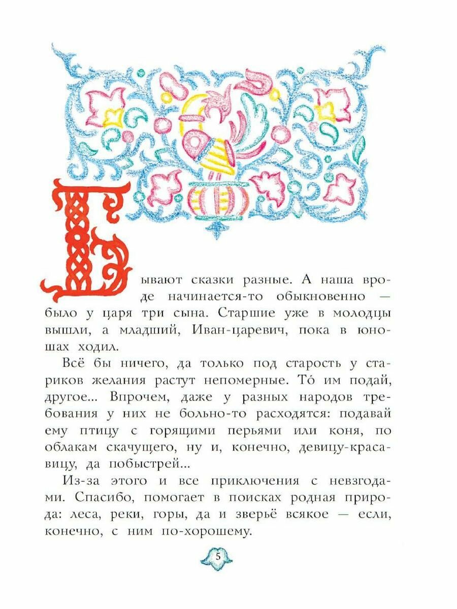 Самый длинный вариант сказки, так что встретим на страницах не только жар-птицу и Серого волка, но и Змея Горыныча, и Кощея Бессмертного. Честно, я такого варианта даже и не встречала. Так что перед нами редкое издание. -