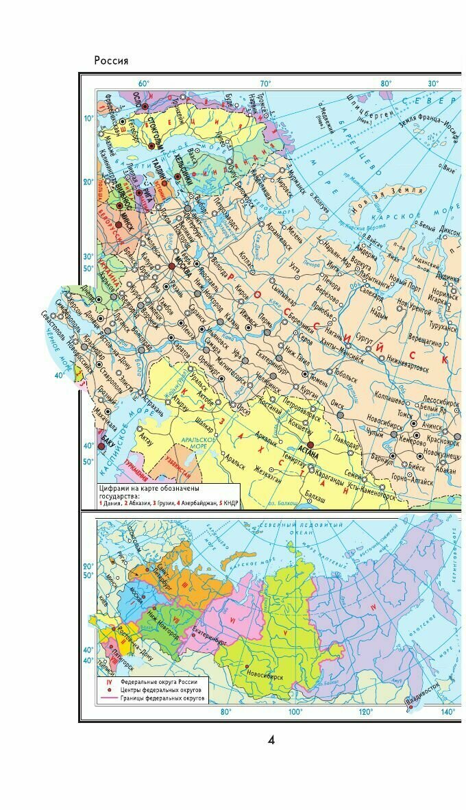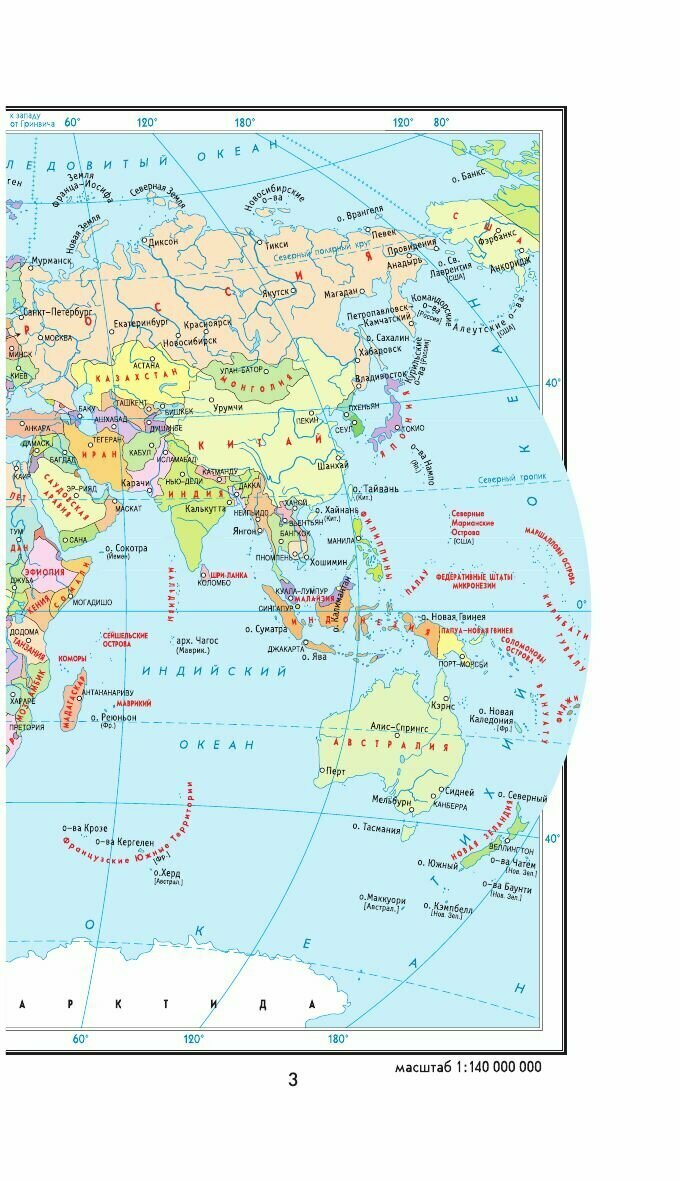 Атлас очень небольшой, некоторым континентам посвящены буквально по одному развороту. поэтому если Вы фанат Австралии, Океании и Латинской Америки, то он явно не для Вас. интересная карта сопредельных с Россией государств в Европе и Закавказье. Мальвины спорная территория Аргентины и Британии, архипелаг Чагос на общей карте за Маврикием. четко обозначены заморские территории Британии и Франции, на которые не нашлось иных претендентов. интересное деление Кинбурнской косы, комментарии по принадлежности Майотты и Антарктиды.