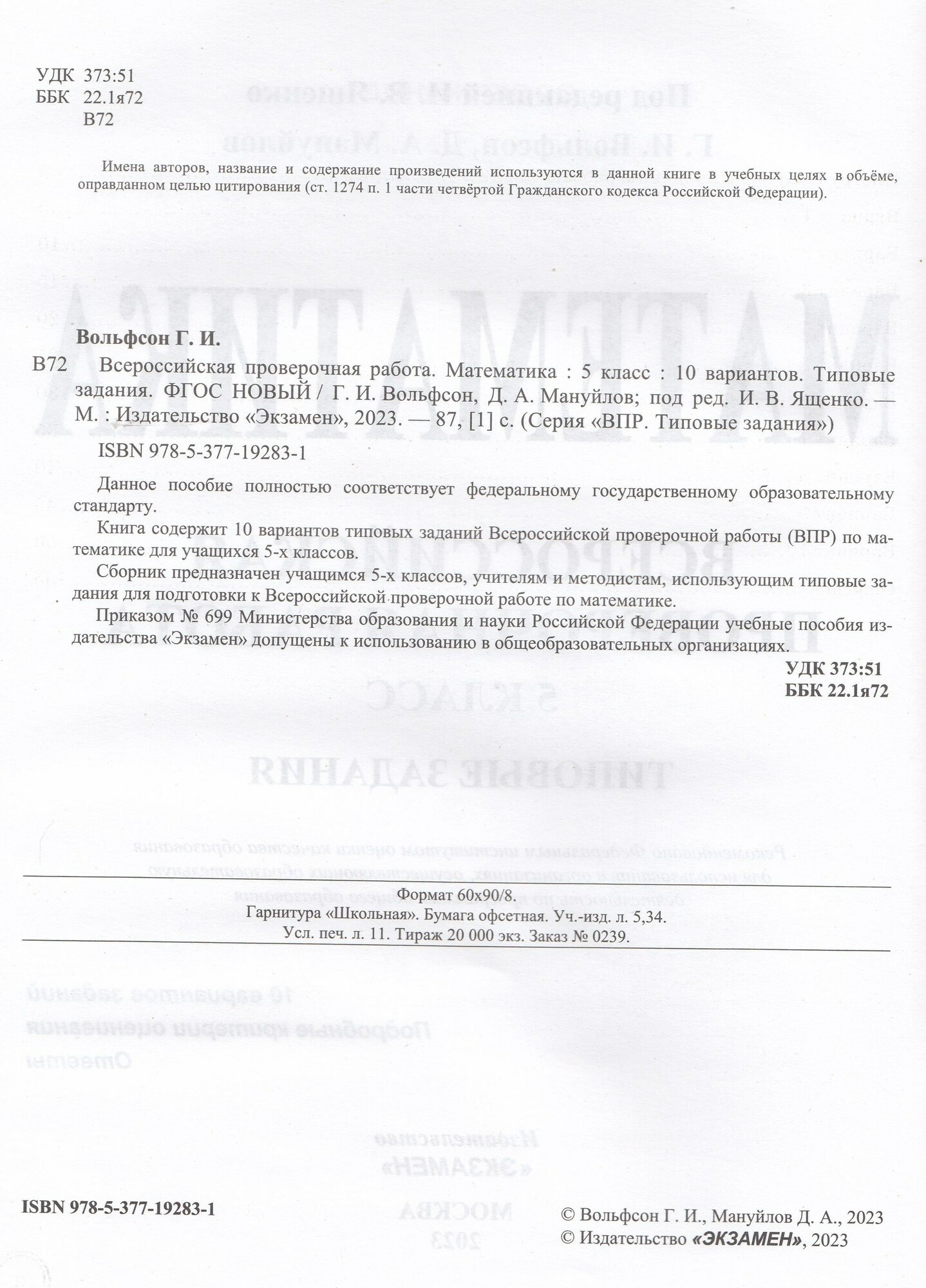 Всероссийская проверочная работа. Математика. 5 класс. Типовые задания. 10 вариантов заданий. Ответы и критерии оценивания (Дмитрий Анатольевич Мануйлов, Георгий Игоревич Вольфсон); Экзамен, 2025