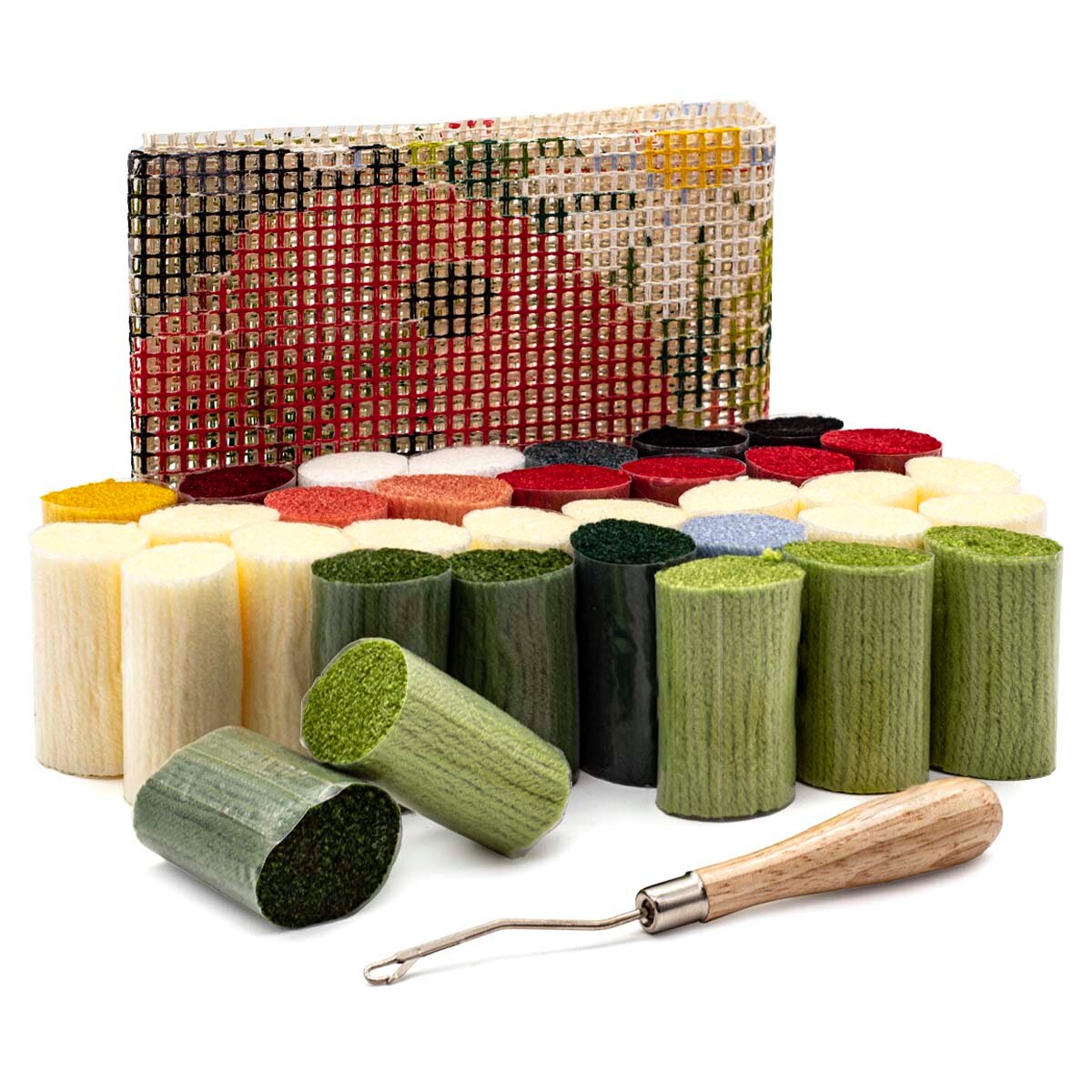 В упаковке: грубоволокнистый страмин, расписанный вручную; нарезанная и упакованная толстая пряжа для вышивания; крючок для ковроткачества; инструкция.