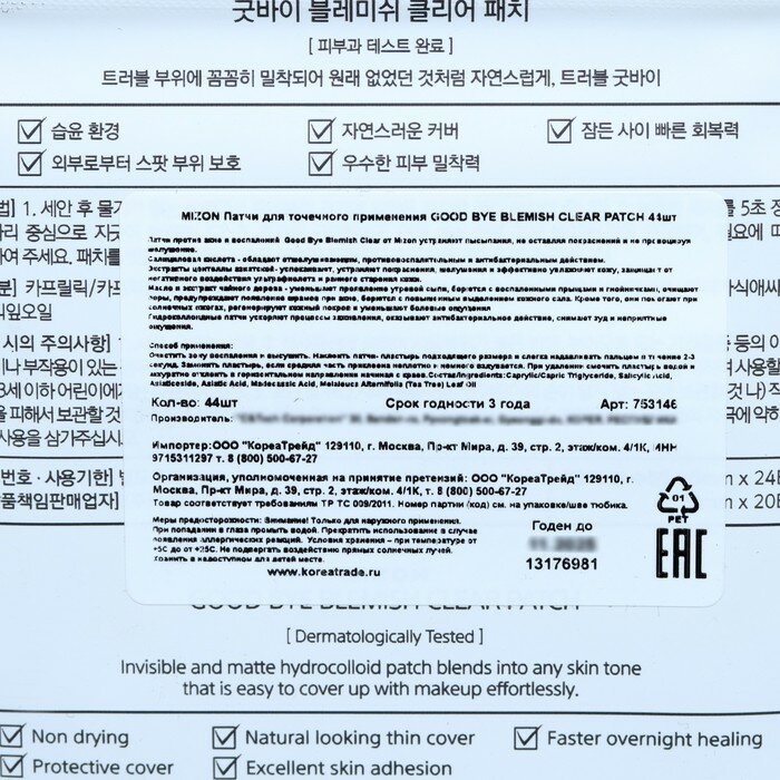Патчи против акне и воспалений Good Bye Blemish Clear от Mizon устраняют высыпания, не оставляя покраснений и не провоцируя шелушение.
