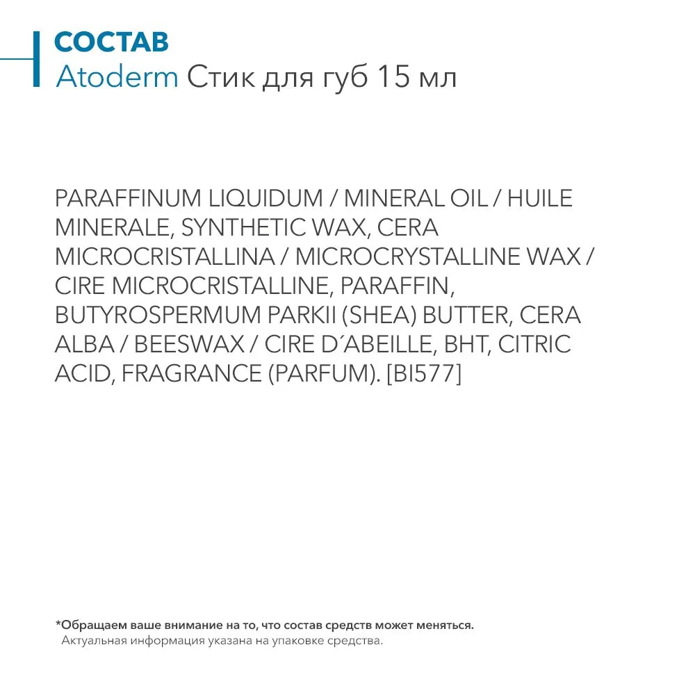 | Состав | paraffinum liquidum, mineral oil, huile minerale, synthetic wax, cera microcristallina, microcrystalline wax, cire microcristalline, paraffin, butyrospermum parkii (shea) butter, cera alba, beeswax, cire d?abeille, bht, citric acid, fragrance (parfum) |