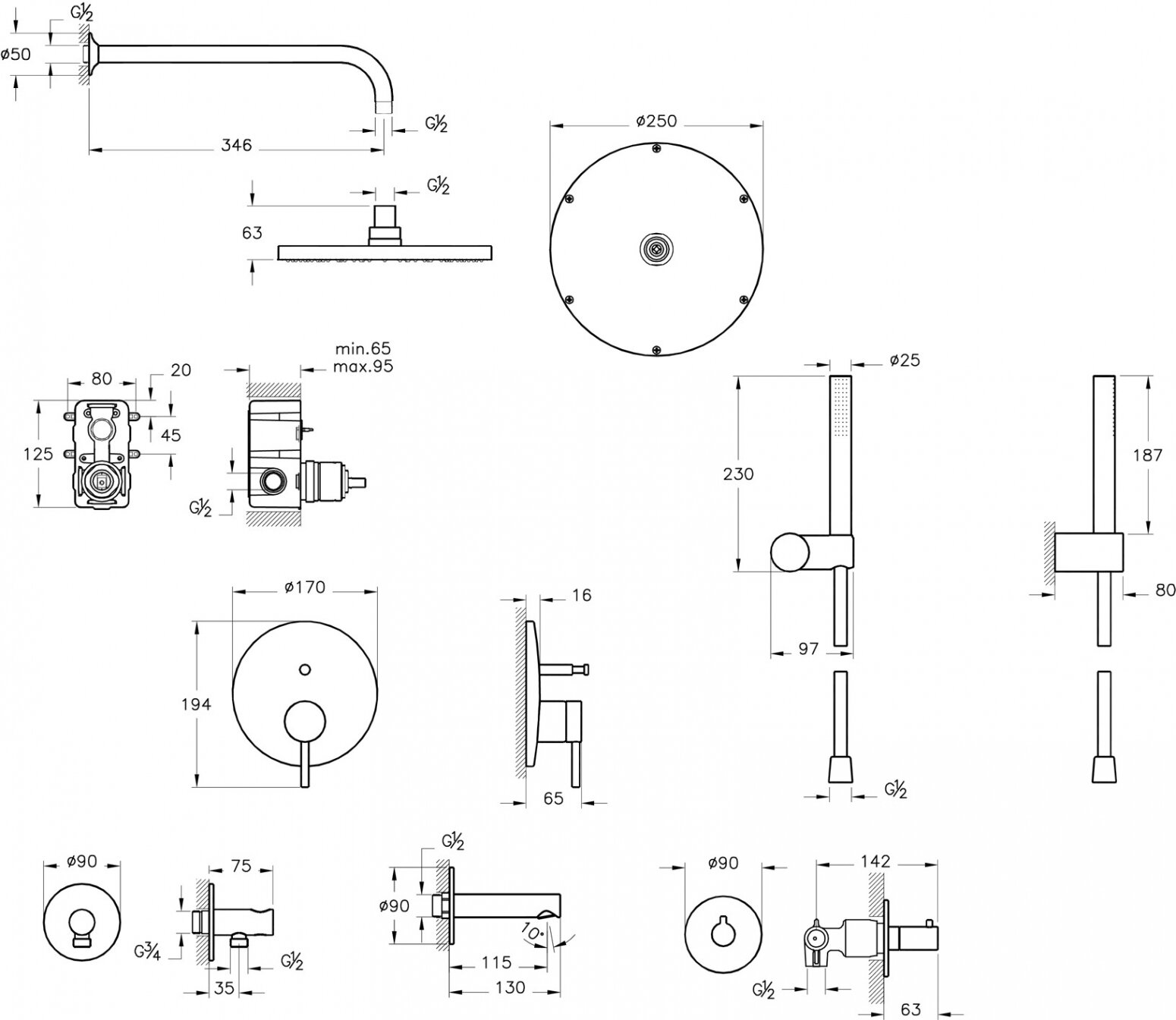 | Состав комплекта | верхний душ, настенный держатель, смеситель, излив, шланговое подключение, переключатель потоков, душевой гарнитур |