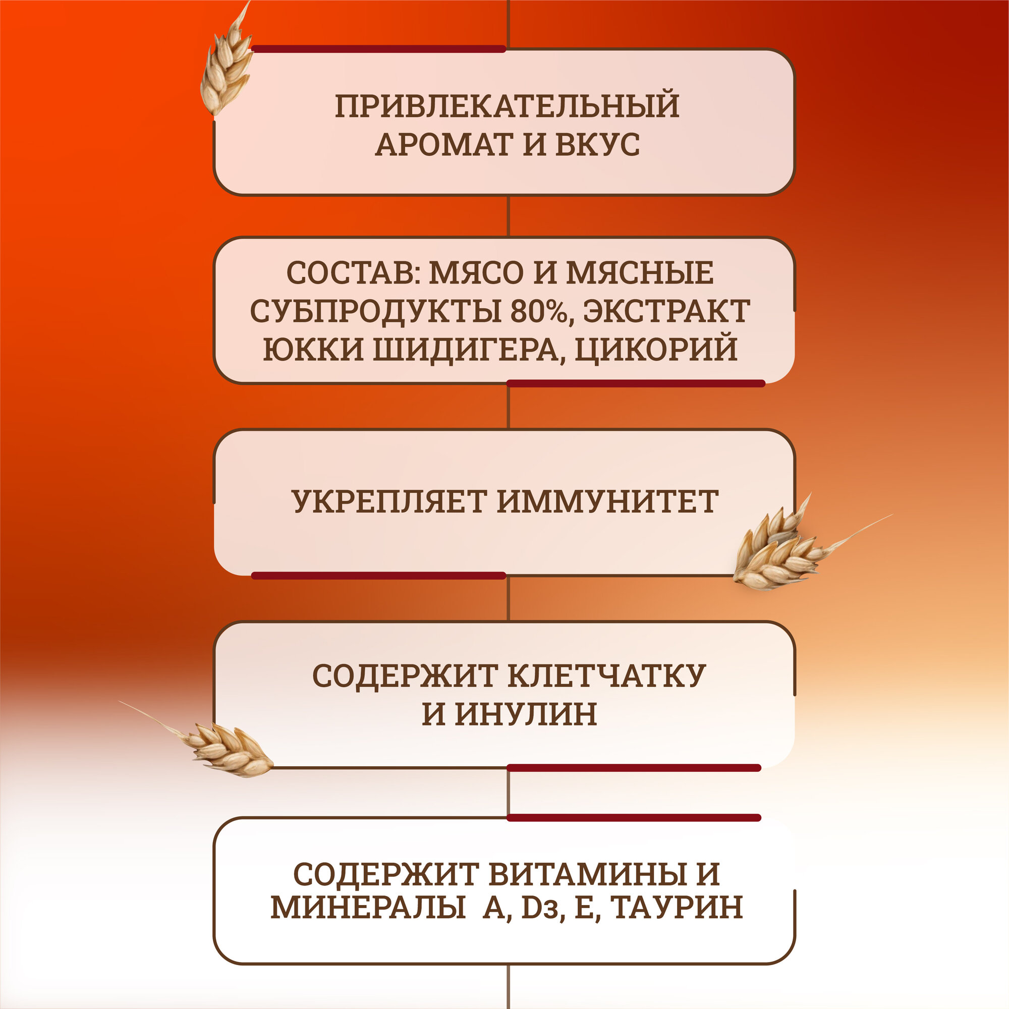 Говядина: мясо и мясные субпродукты не менее 80 % (в том числе говядина), таурин, витамины и минералы, экстракт Юкки Шидигера, цикорий.