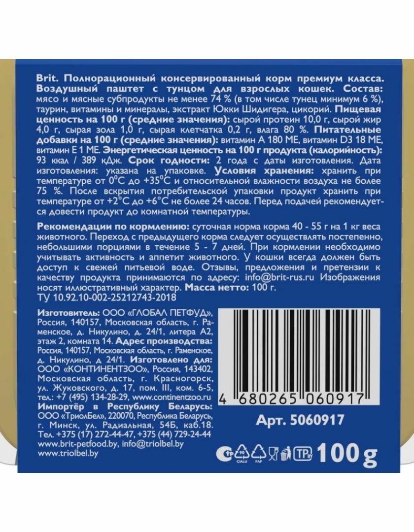 Brit воздушный паштет для взрослых кошек (Тунец 100 г.)