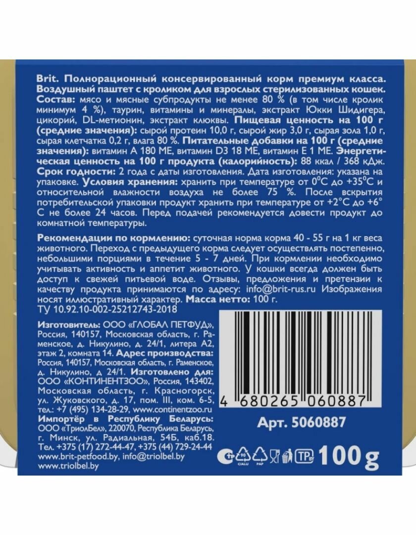 На сегодняшний день товар «Brit воздушный паштет для стерилизованных кошек (Кролик 100 г.)» можно купить с кешбеком в 3 магазинах: Ашан, Яндекс.Маркет, ГЛОБУС