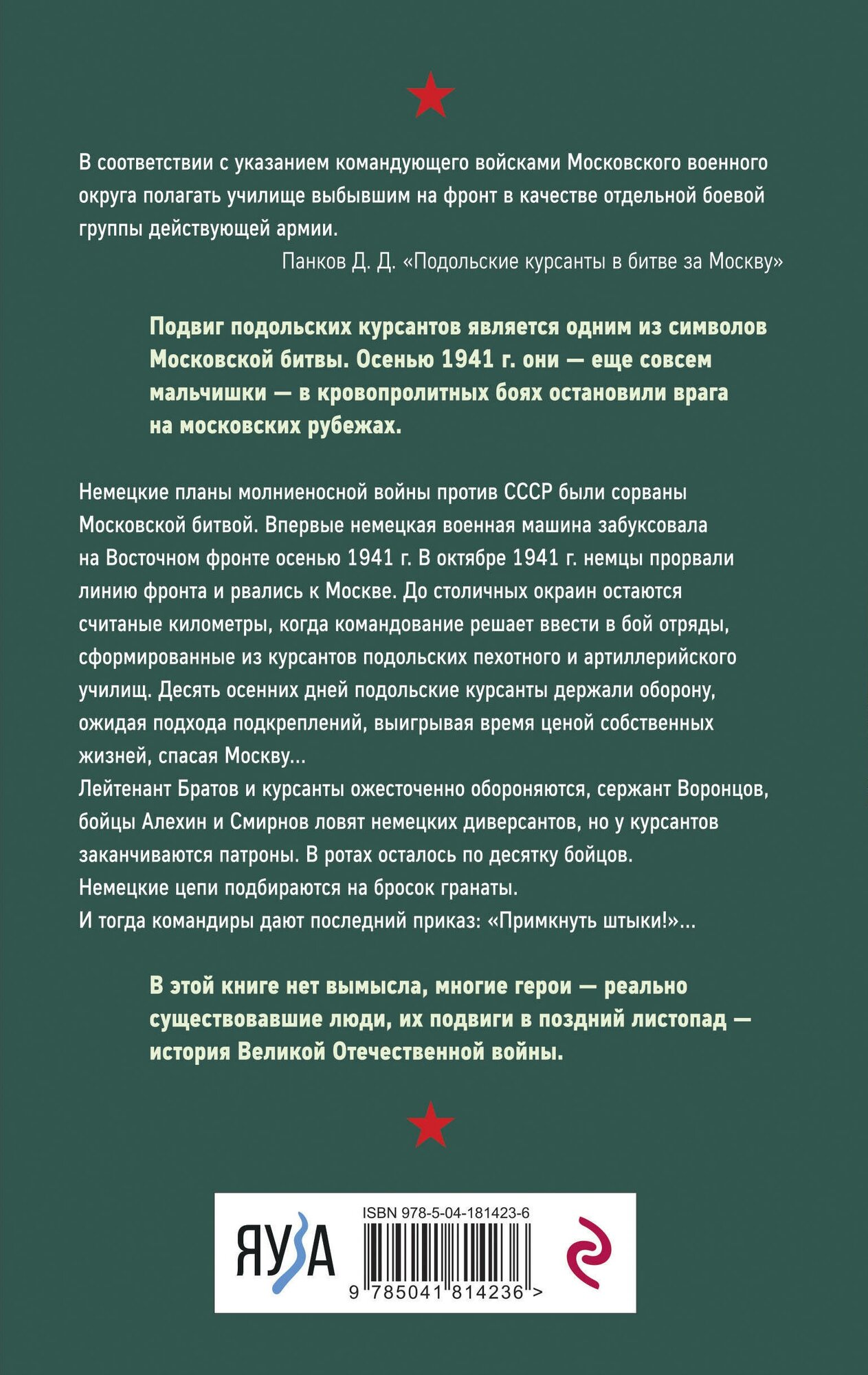 В октябре 1941 г. немцы прорвали линию фронта и рвались к Москве. До столичных окраин остаются считанные километры, когда командование решило ввести в бой отряды, сформированные из курсантов Подольских пехотного и артиллерийского училищ. Десять осенних дней подольские курсанты держали оборону, ожидая подхода подкреплений, выигрывая время ценой собственных жизней, спасая Москву...