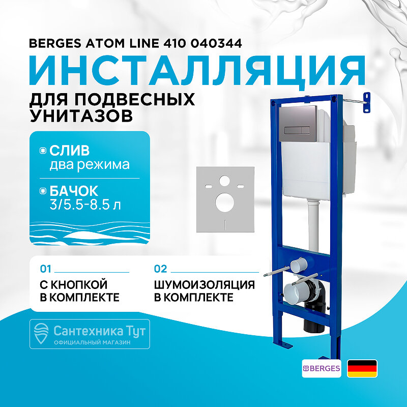 Инсталляция для унитаза Berges Аtom Line 040344. Стальная рама с антикоррозийным покрытием, Расчётная нагрузка до 400 кг. Ножки регулировкой высоты. Межосевое расстояние под крепежные шпильки унитаза 18 и 23 см. Бачок с функцией шумоподавления. Двухрежимная кнопка смыва, матовый хром Эконом слив 3л, полный слив настраивается от 5,5 до 8,5л Монтажный кнопочный узел, Инсталляция для унитаза Berges Novum 04026. Полный комплект патрубков, лекала для монтажа отверстий