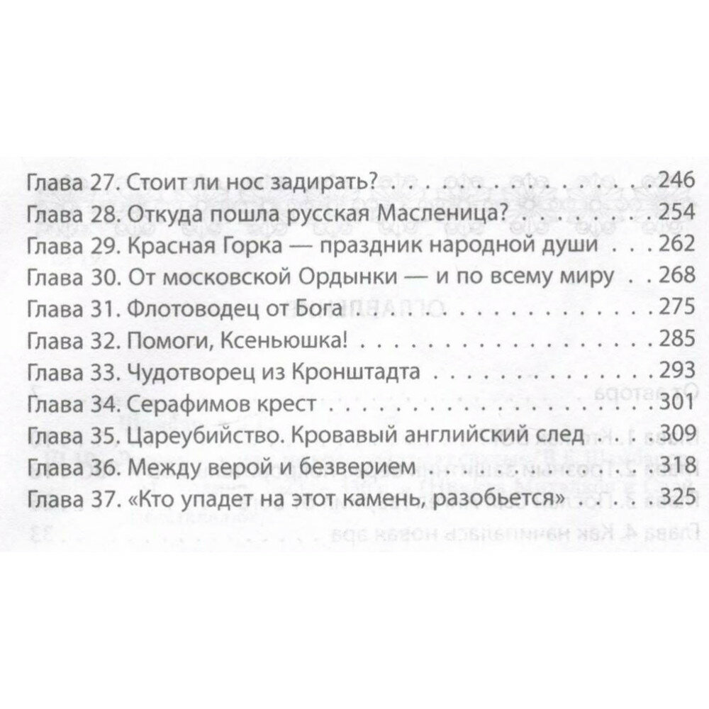 Сначала про товарный вид. Книга отличного оформления, на высококачественной бумаге и в твердом переплете. Автор владеет большой широтой мировоззренческих понятий, например: дает определение, что в Православии \"архистратиг\" - это главнокомандующий; а Святой пророк Илья - это покровитель ВДВ и ВВС России; и в каждой главе дает нам дни почитания святых по-новому и по-старому стилю. А в последней, 34-й главе, доходит до 1937 года и рассказывает про Священномученика Серафима (Чичагов). В книге приведена как квалиметрическая оценка нашей страны (критерий духовности), так и доходящая до каждой семьи традиция. Расписаны традиции родительских суббот (глава 19), как и когда почитать своих родителей, когда ходить на кладбище и какова подоплека всего этого. Каждому семьянину посвящается эта книга, и от меня глубокая благодарность автору и издателям!
