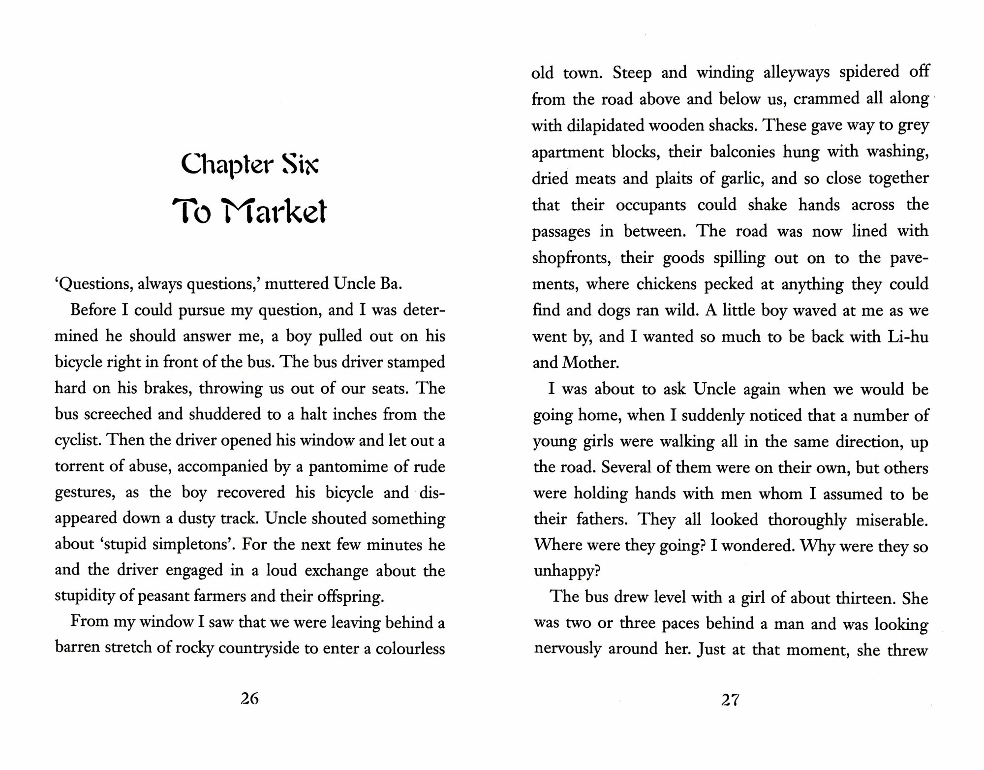 When her husband dies, Lu Si-yan's mother is encouraged to sell her young daughter into domestic service. Lu Si-yan is just eleven when sold by her uncle. Nearly two years will pass before she can get back home to her mother and brother. In this powerful and compelling novel Sally Grindley portrays the life of a young girl in China, a young girl whose life is said to be like 'spilled water'. With a brilliant first-person narrative and a powerful description of time and place, this novel is gripping, heart-wrenching and utterly mesmerising.