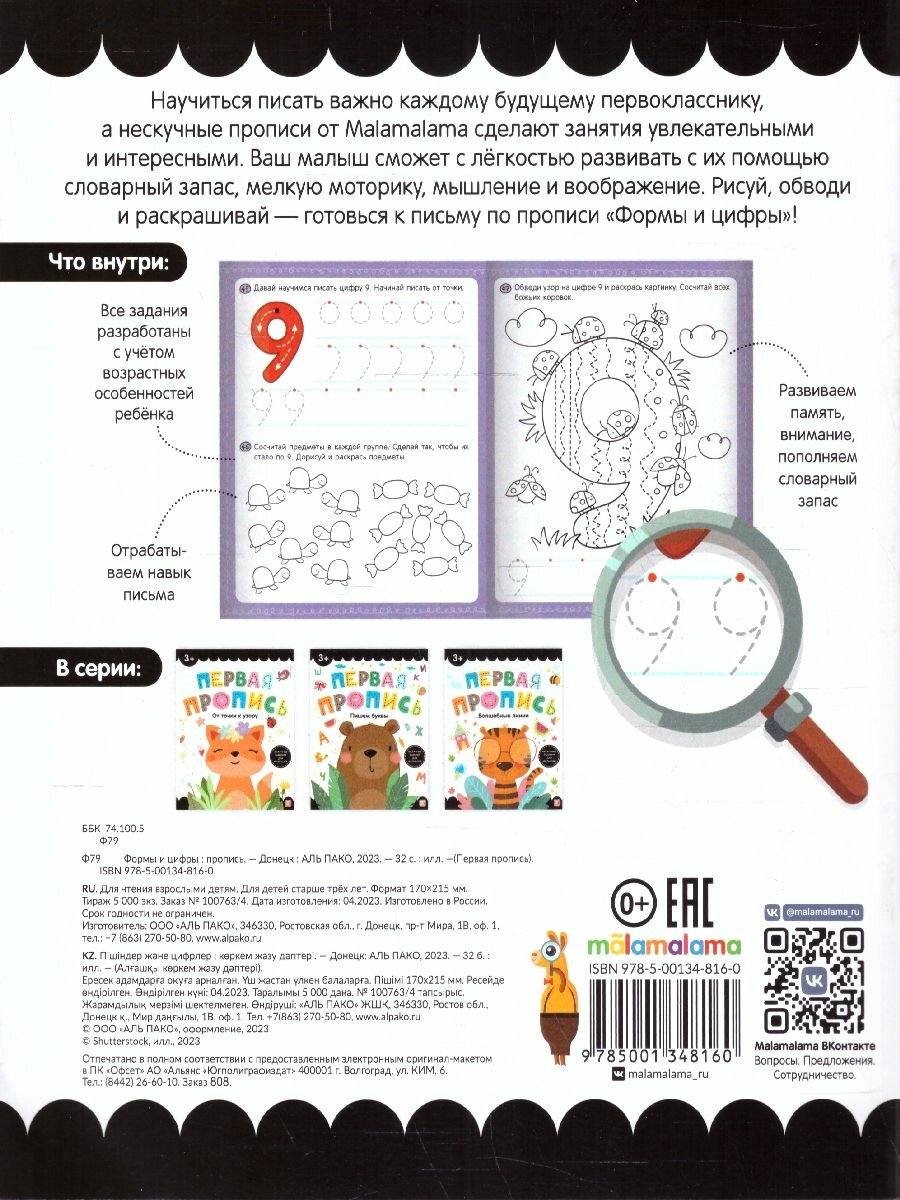 Научиться писать важно каждому будущему первокласснику, а нескучные прописи от Malamalama сделают занятия увлекательными и интересными. Ваш малыш сможет с легкостью развивать с их помощью словарный запас, мелкую моторику, мышление и воображение. Рисуй, обводи и раскрашивай - готовься к письму по прописи "Формы и цифры"!