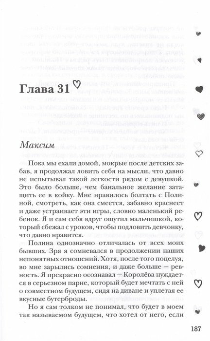 Современная романтика не перестаёт меня удивлять. Эта книга ещё по аннотации показалась мне слишком уж заезженной, например здесь присутствует метка «от ненависти до любви», но при этом как таковой вражды между героями нет. Они изначально сразу начали друг к другу тянуться и эти потуги «нелюбви» выглядели странновато. Однако сюжет интересный, я была рада прочитать такую историю.