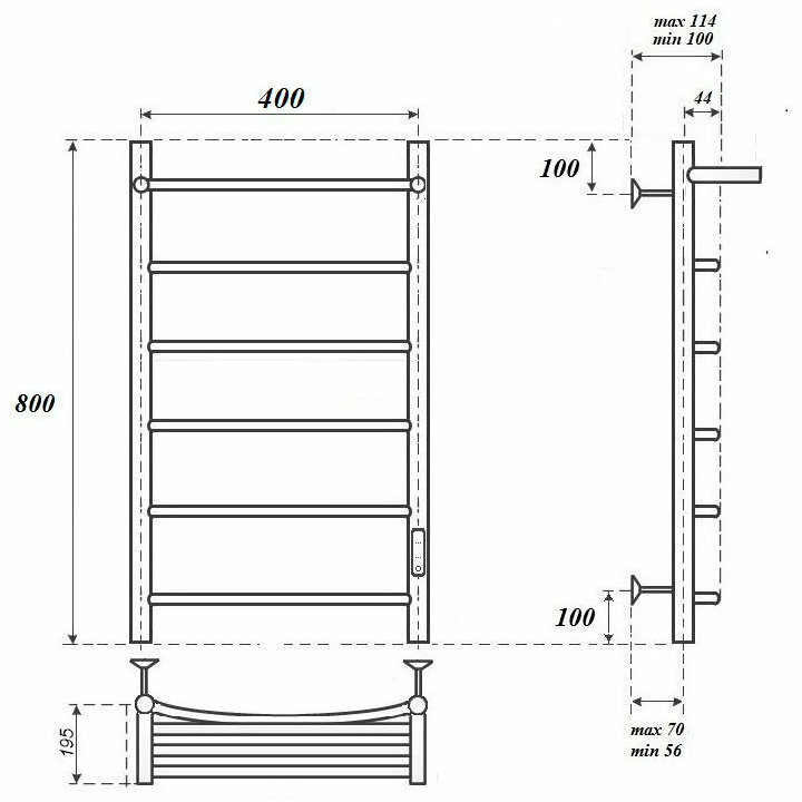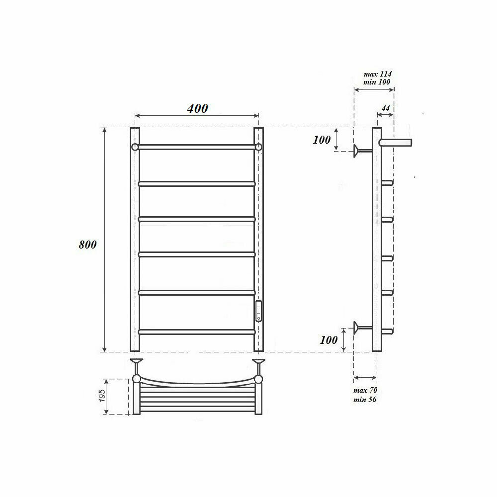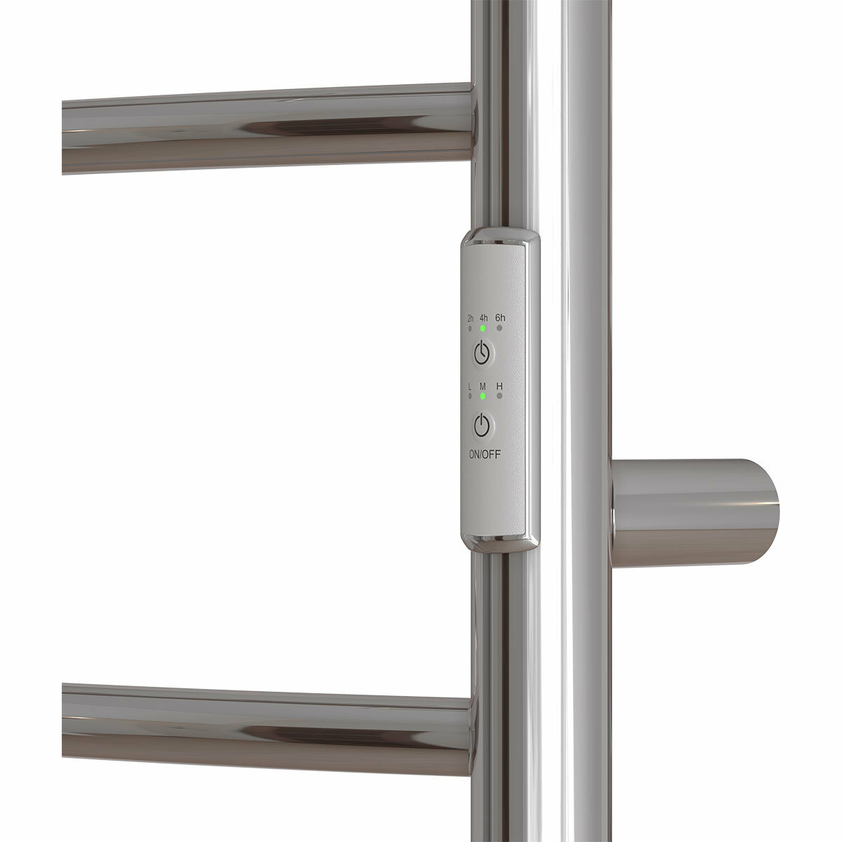 Полотенцесушитель оборудован блоком управления с таймером на 3 режима (2, 4 ,6 часов) и возможностью регулировки температуры (3 температурных режима). Блок управления расположен на правой стойке. Подключение к электросети осуществляется при помощи кабель-вилки или скрытого подключения, которое позволяет легко и просто убрать видимые провода.