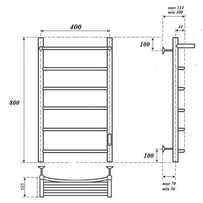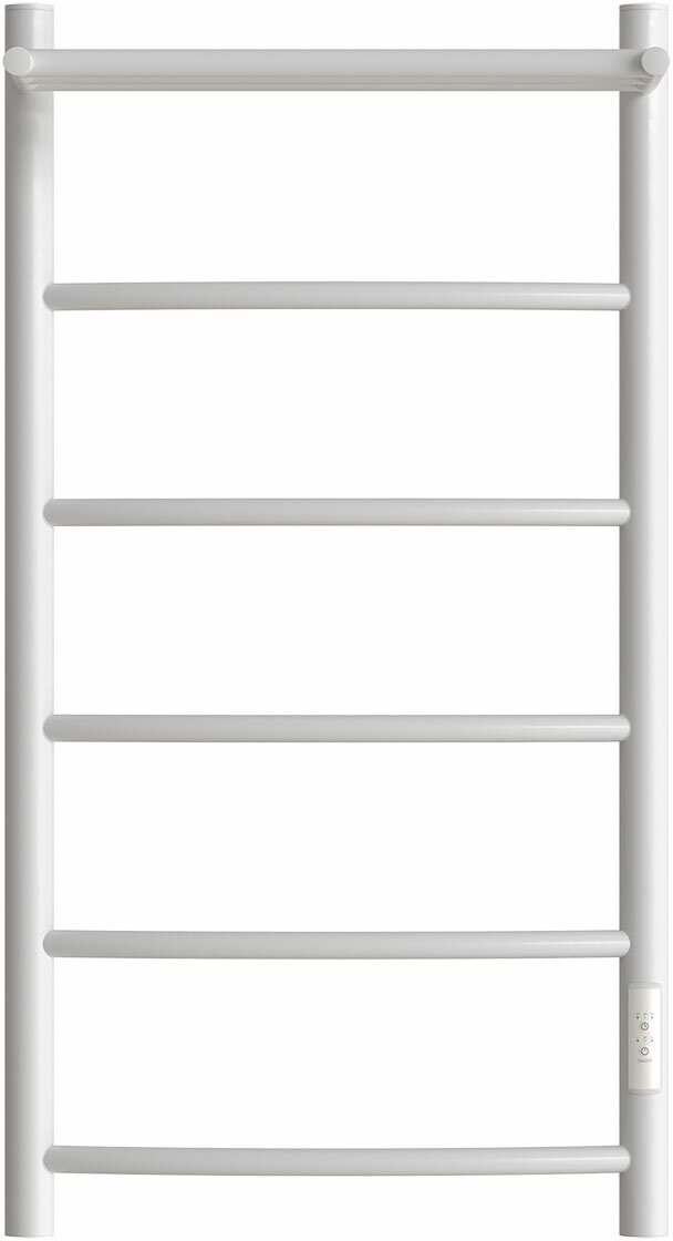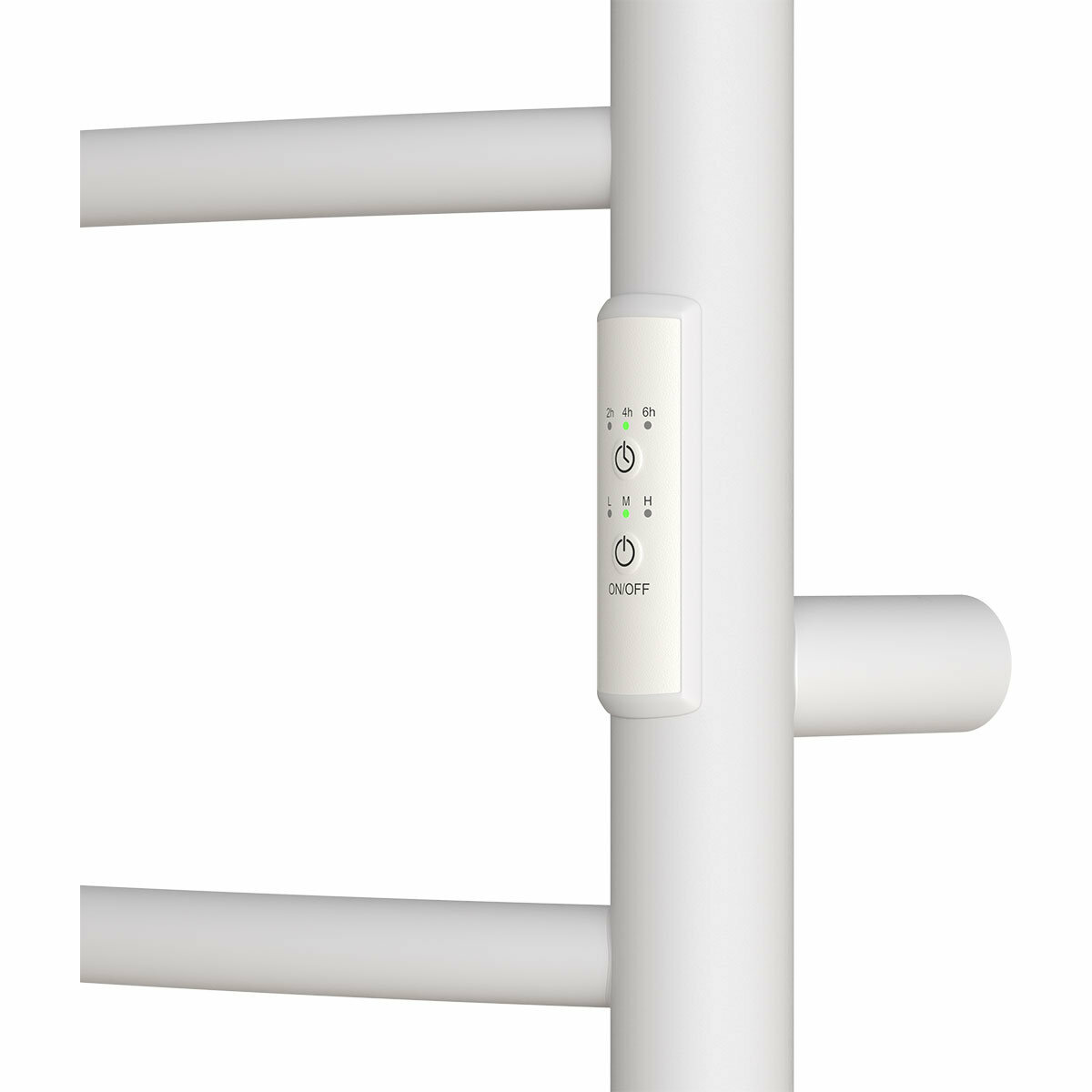 Полотенцесушитель оборудован блоком управления с таймером на 3 режима (2, 4 ,6 часов) и возможностью регулировки температуры (3 температурных режима). Блок управления расположен на правой стойке. Подключение к электросети осуществляется при помощи кабель-вилки или скрытого подключения, которое позволяет легко и просто убрать видимые провода.