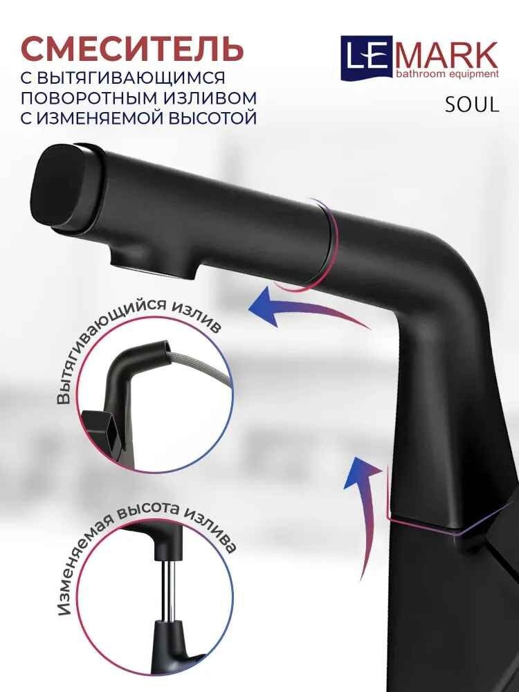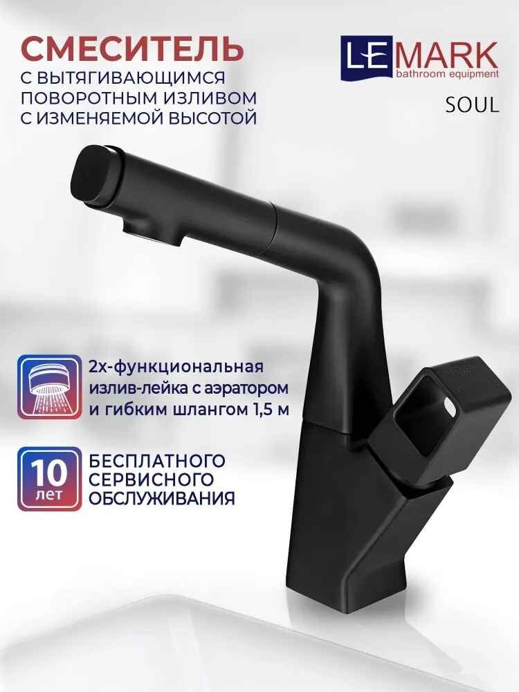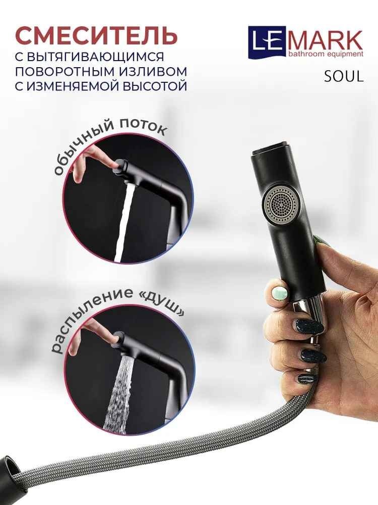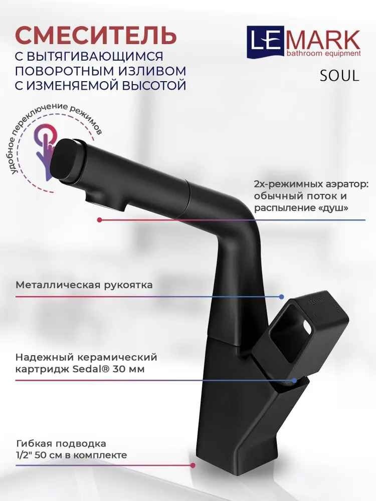 Смеситель для раковины Lemark . Серия смесителей SOUL. керамический картридж 30 мм. 2-функционалный аэратор. Излив с изменяемой высотой. Вытяжной шланг 1,5 м. Свинцовый отвес. Гибкая подводка 1/2 50 см. Присоединительная группа для настольного крепления. Металлическая рукоятка.