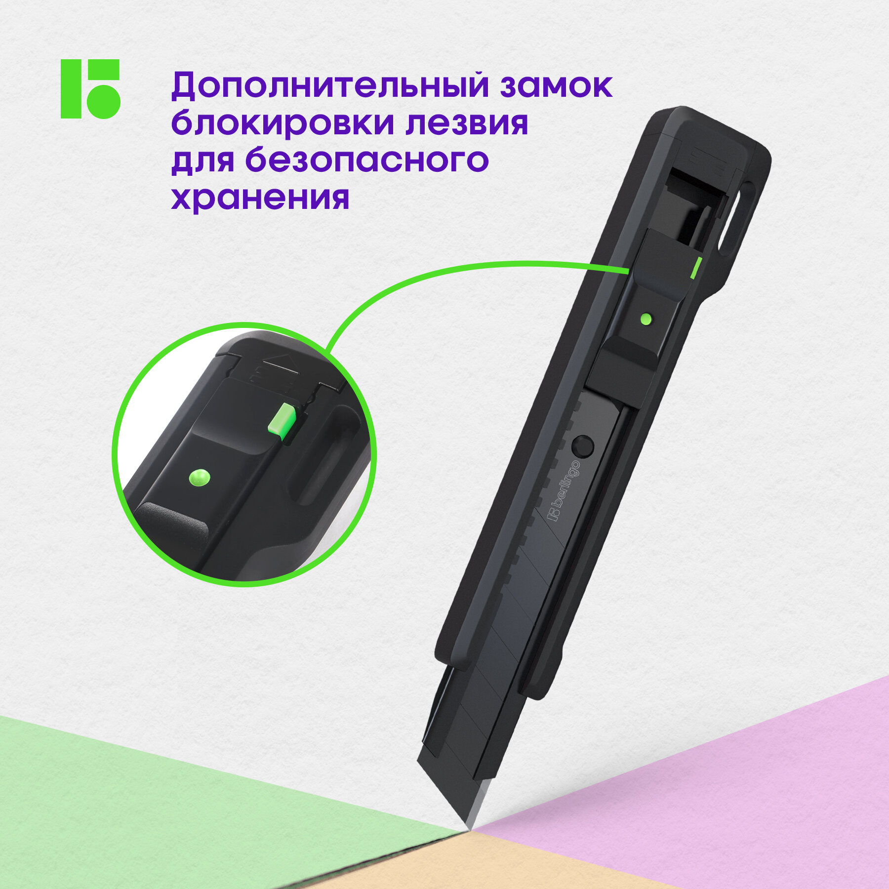 Нож канцелярский с автоматической системой фиксации лезвия auto-lock. Корпус ножа сделан из ABS пластика с покрытием soft touch. Комплектуется износостойким лезвием черного цвета из стали SK2. Ширина лезвия - 18 мм. Модель оснащена дополнительным замком блокировки лезвия.