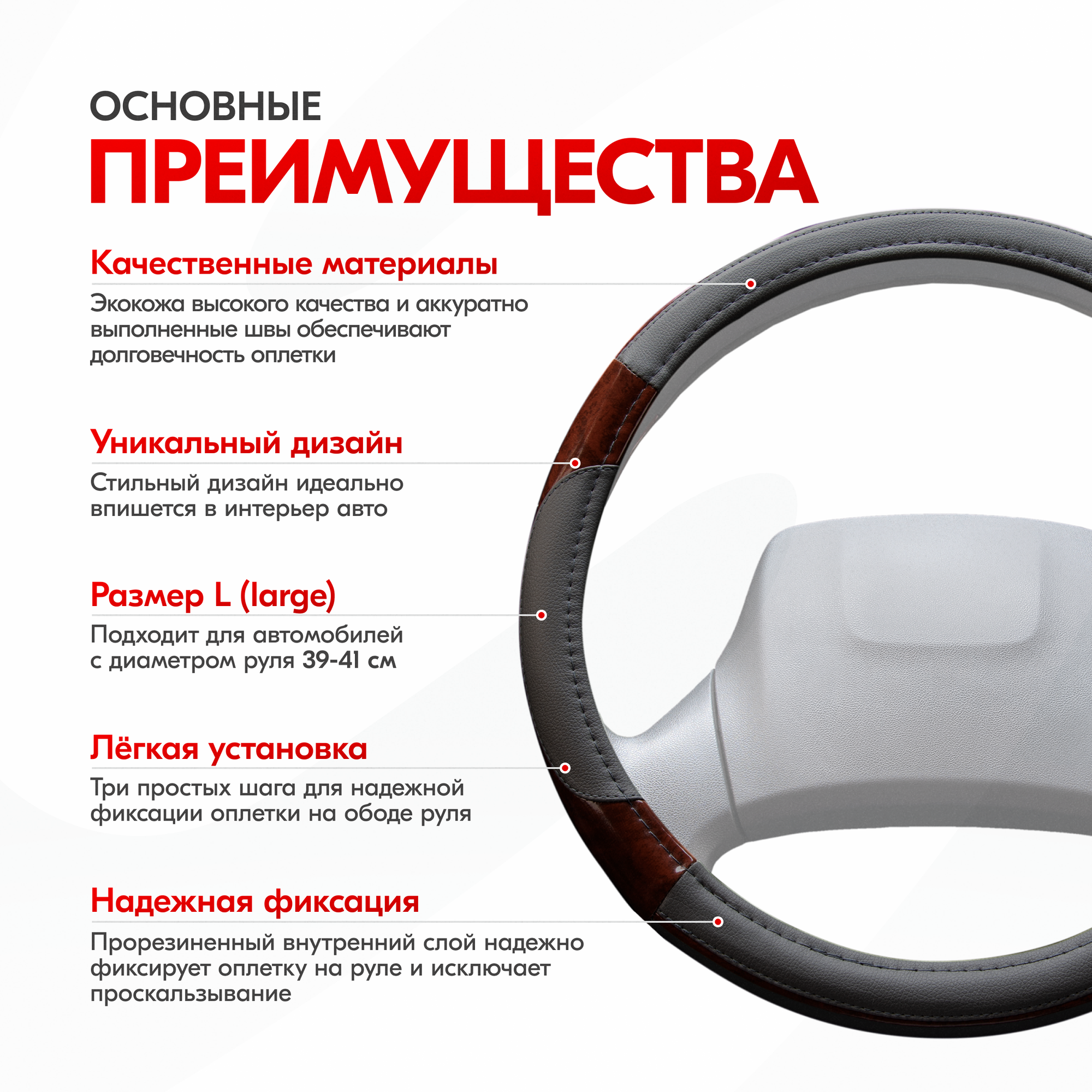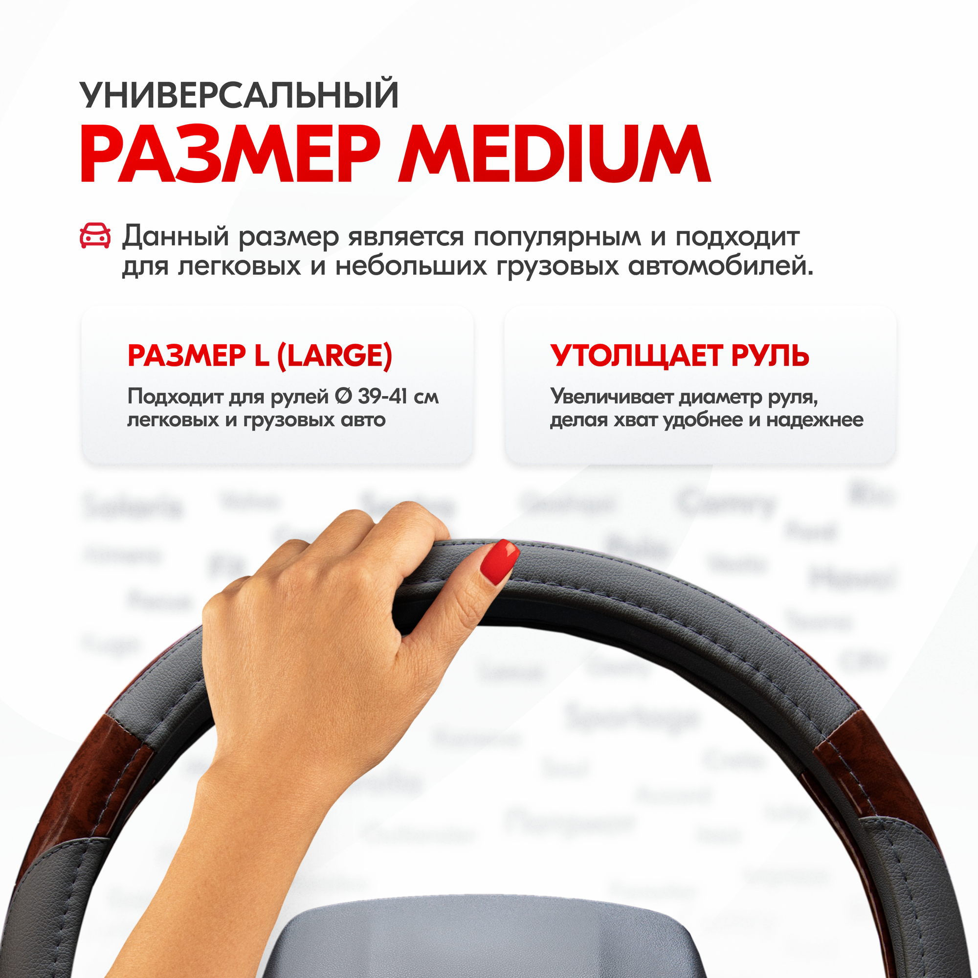 Оплетка на руль - сверхпопулярный автомобильный аксессуар. Сделана из высококачественного материала экокожа. Нейтральный черно-коричневый цвет отлично вписывается в любой интерьер. Стильный дизайн выгодно подчеркнет хороший вкус автовладельца и его индивидуальность. Оплетка на руль Wood-3 размера «L» подходит на множество авто. Таких, как Toyota, Honda, Hyundai, Kia, ВАЗ, нива, LADA и большинство китайских автомобилей. На руль оплетка устанавливается легко, не требует долгих манипуляций, достаточно минимума усилий и предварительного нагрева для более легкого надевания. Поэтому справится даже хрупкая девушка.Внимание! Важно ознакомиться с последовательностью натягивания оплетки (см. слайд). Нагреть оплетку можно обычным феном, на солнце или горячим воздухом в машине.Тянется при установке, при этом отлично держит форму и плотно прилегает к рулю, повторяя его рельеф и изгибы. Вот почему чехол на руль автомобиля универсальный. Преимущества: износостойкая, без запаха, устойчива к царапинам и порезам.Чехол на руль с отменными рабочими характеристиками: скрывает имеющиеся потертости и царапины, уберегает от появления новых. Оплетка на руль не перегревается летом от солнечных лучей и не обжигает руки, а зимой не дубеет на морозе, не растрескивается, материал оплетки очень приятный на ощупь.За счет красивого внешнего вида чехол на руль автомобиля хорош как подарок девушке, как подарок мужчине в машину.Противоскользящий материал ПВХ с внутренней стороны гарантирует - оплетка не будет смещаться по ободу колеса, обеспечит крепкое сцепление с его поверхностью, что критично важно во время вращения руля.
