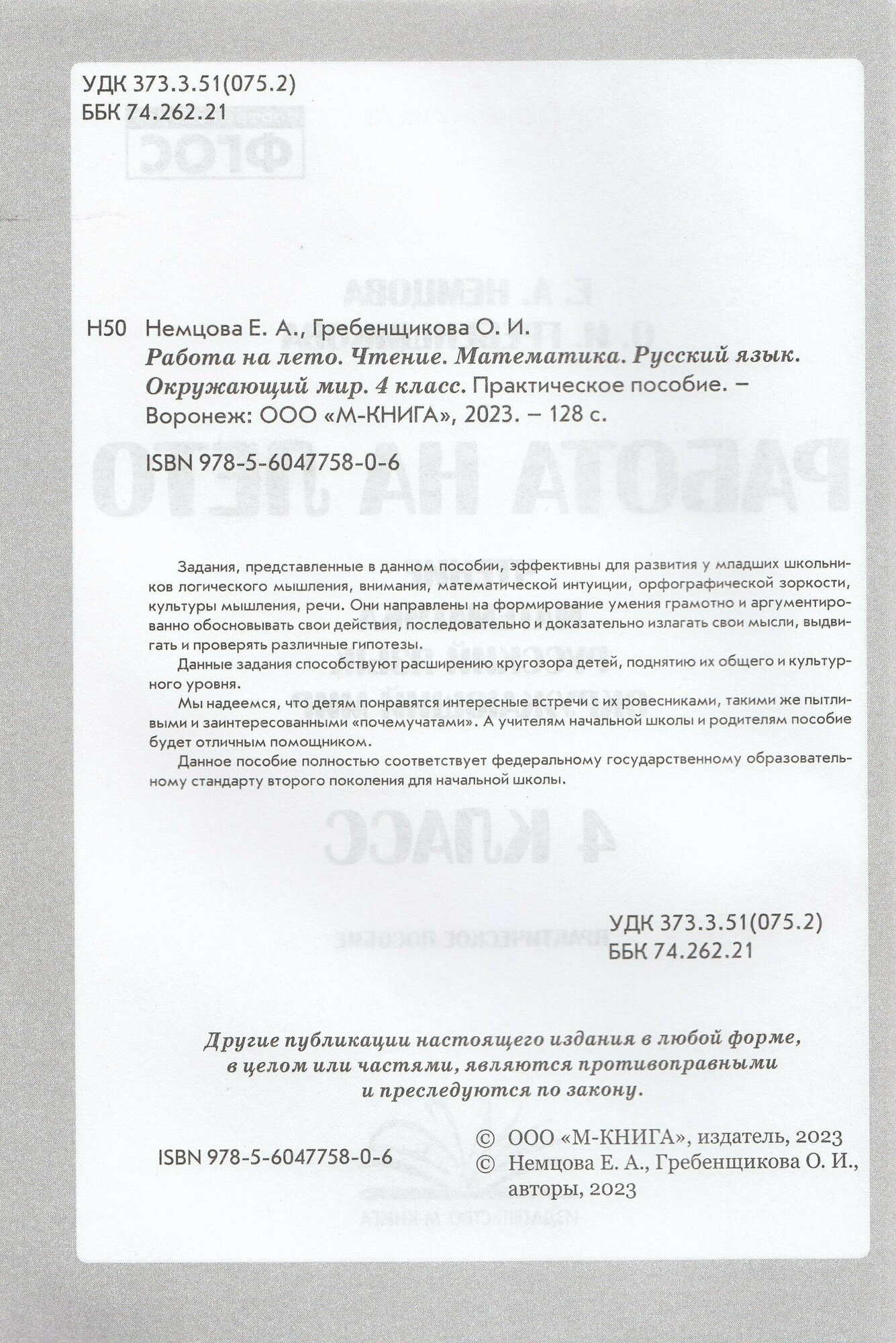 Чтение. Математика. Русский язык. Окружающий мир. 4 класс. Работа на лето. ФГОС (Немцова Екатерина Алексеевна; Гребенщикова Ольга Ивановна); М-Книга, 2023