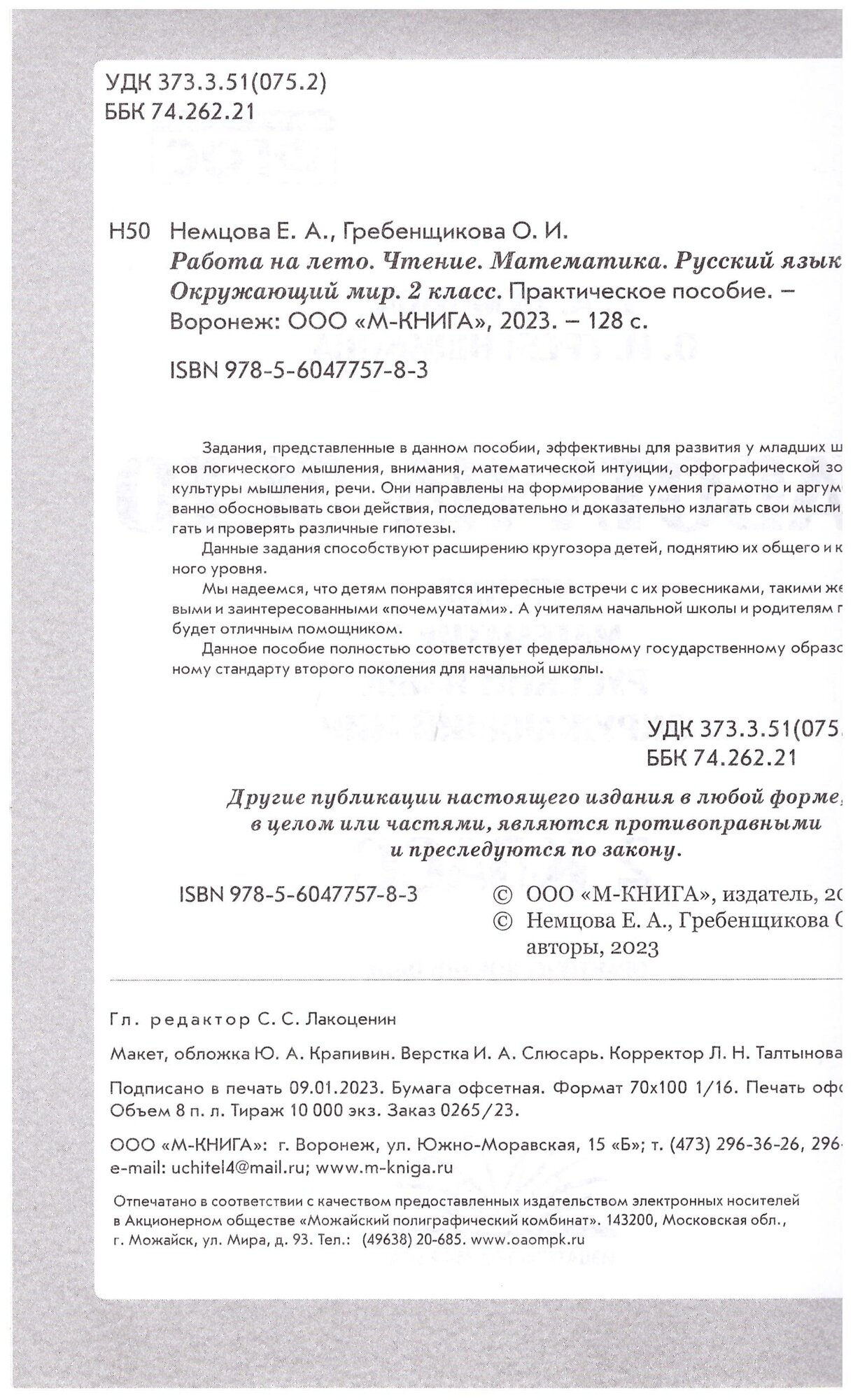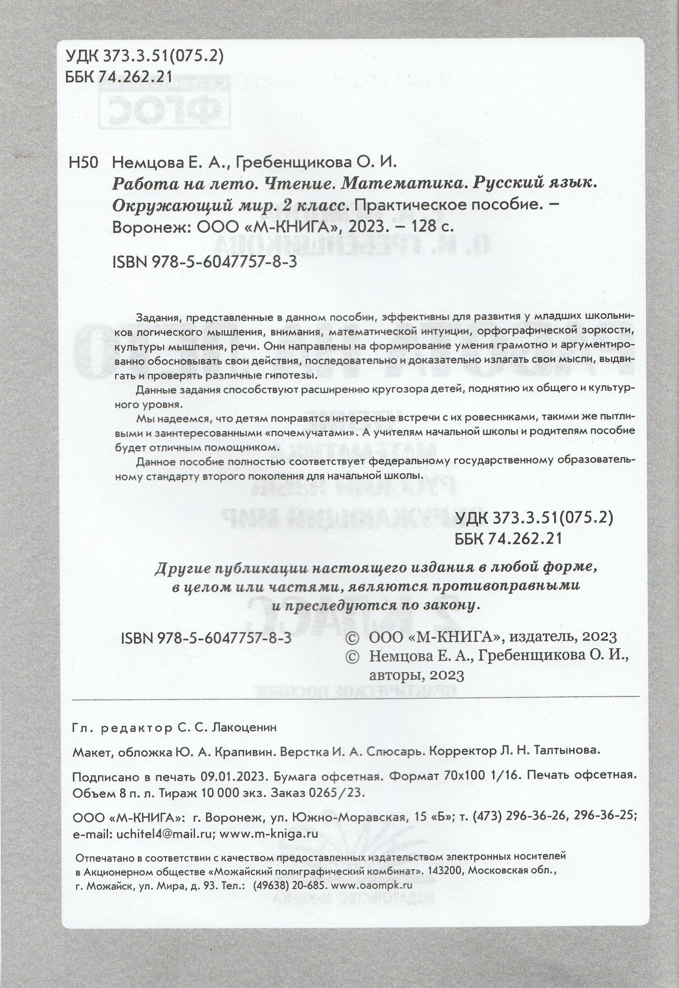 Чтение. Математика. Русский язык. Окружающий мир. 2 класс. Работа на лето. ФГОС (Немцова Екатерина Алексеевна; Гребенщикова Ольга Ивановна); М-Книга, 2023