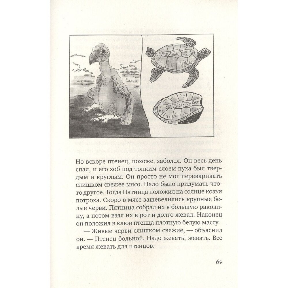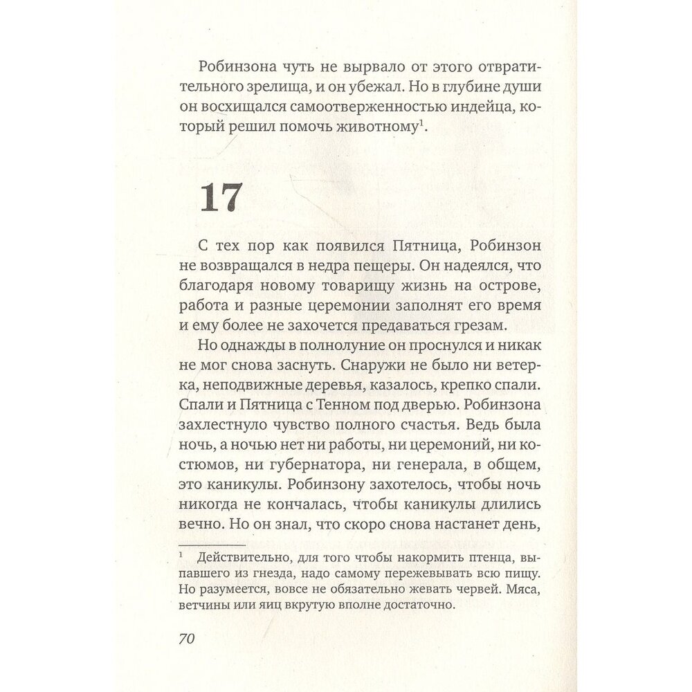 Бессмертная история Робинзона, переосмысленная классиком Мишелем Турнье, вот уже почти пятьдесят лет является символом французской литературы для юных читателей. Робинзон пытается превратить своё вынужденное пристанище в миниатюрное подобие той цивилизации, которую он знал. Но жизнь полна сюрпризов. Островная цивилизация погибнет, и тот, кто ещё вчера был слугой Робинзона, станет его учителем и другом...